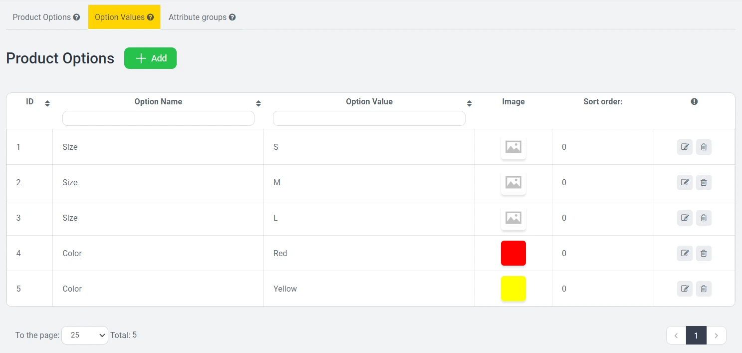 To create values for your attributes, go to the "Option Values" tab and, similarly, click "Add". In the drop-down list "Option Name", select the attribute for which you are creating a value, specify this value and, if desired, add an image for it. The image will be visible on the product page if the attribute has an "Image" or "List with Images" type.