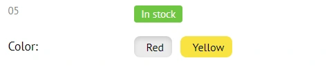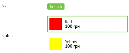 If your rental package includes the "Different colors of the product" module, you can upload different images for different attribute values in the product card. If this attribute has a type that allows switching between attribute values on the product page (for example, "Dropdown"), and if the "Change product image" switch is enabled, the image of the product will change when a specific attribute value is selected on the product page.