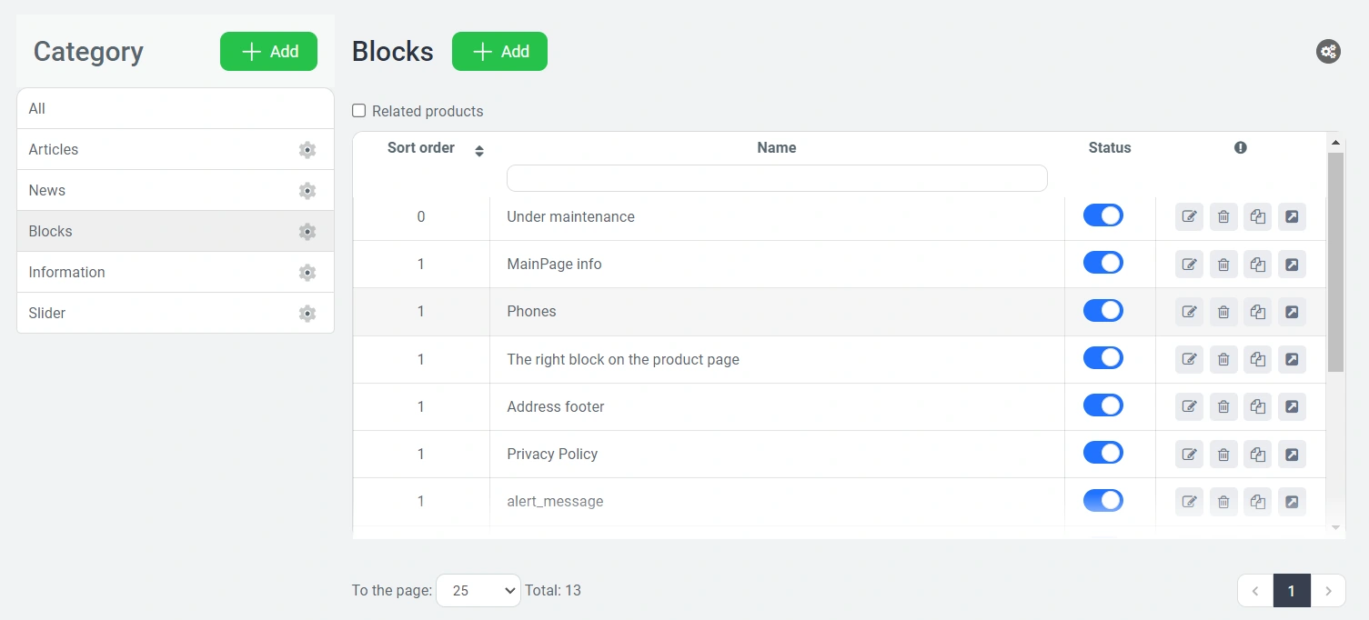 On the "Content" - "Pages" page in the "Blocks" section, there is an article titled "Phones". The phone number specified there is displayed in the store's header. If desired, you can configure this article so that clicking on the phone number immediately initiates a call. We will explain in more detail how to do this in this instruction.