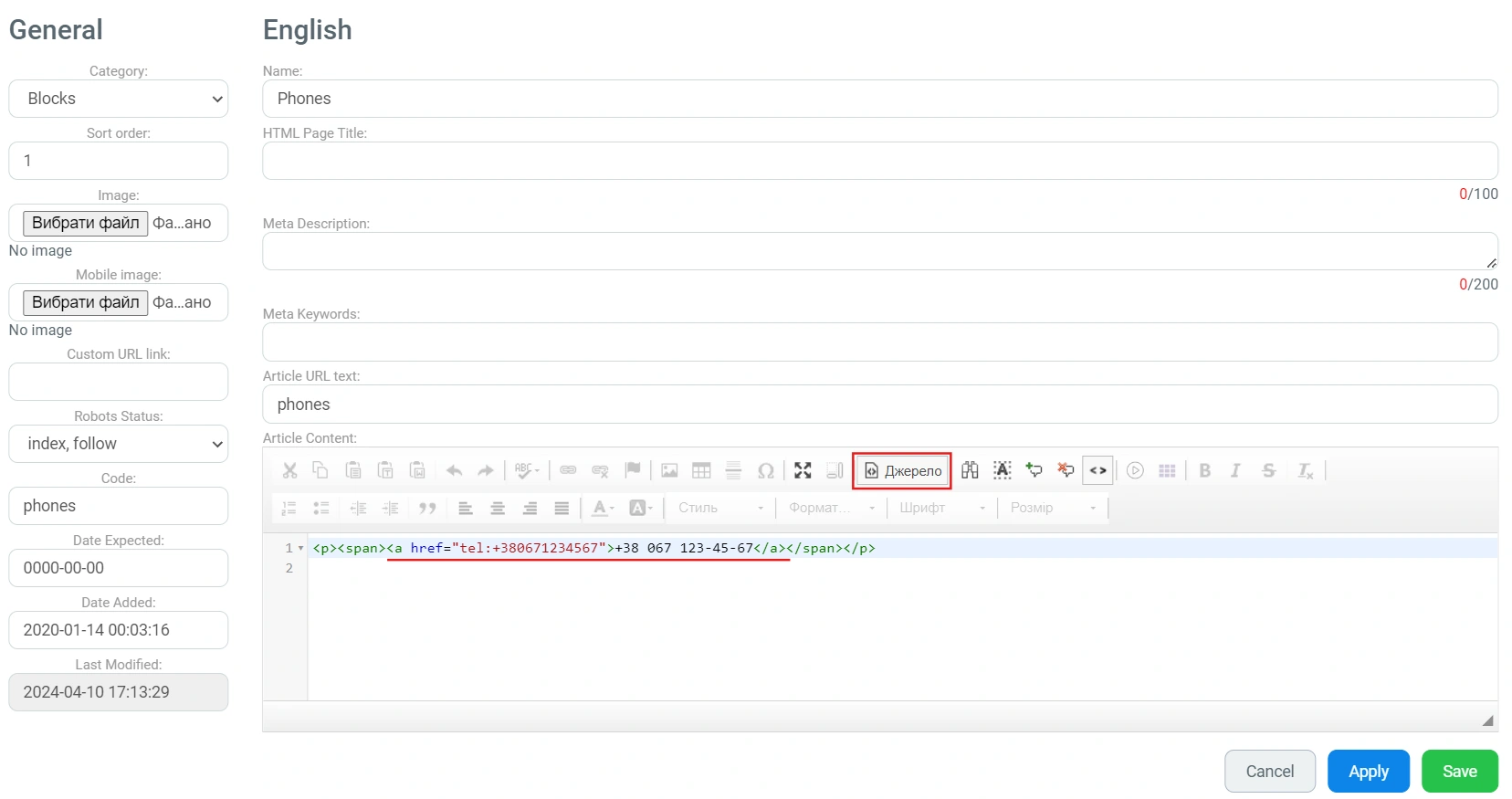 In this window, click "Source", the phone number should be wrapped in a tag of the form <a href=”…”>…</a>. In the href attribute, you need to write tel: followed by the phone number in full format with the + sign and without any separators.