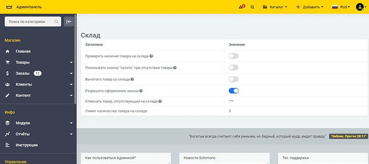 Of software, it is necessary to implement a program of warehouse accounting. This can be off-the-shelf software or a self-written program specifically for the online store engine. On the choice of the program should also spend time comparing the advantages and disadvantages, flexibility and scalability, user-friendly interface, price, and other characteristics. Online stores based on CMS SoloMono can integrate with 1C program. In the admin panel you can easily manage the settings of the warehouse.