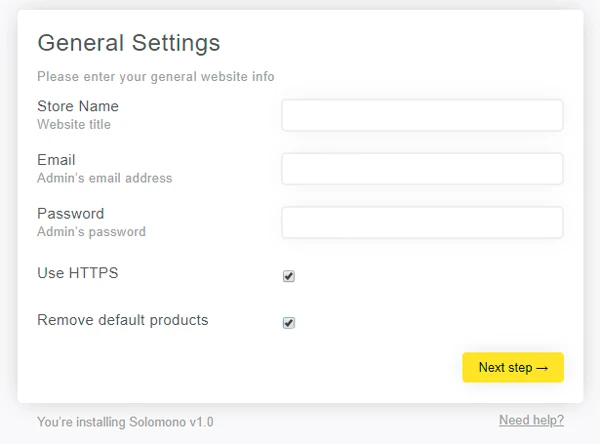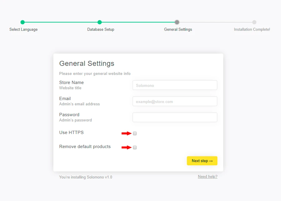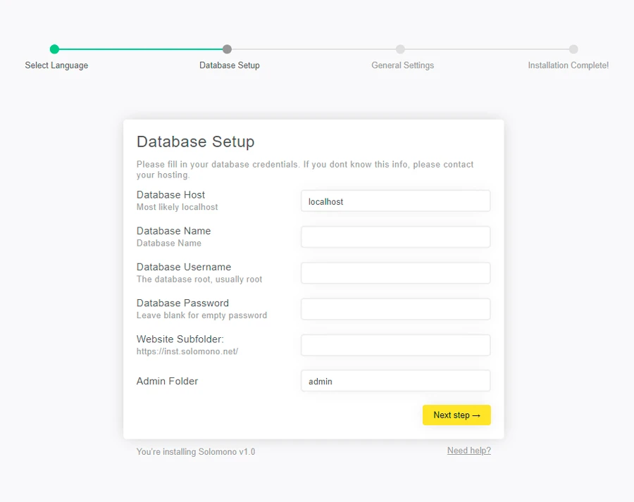 5. Click “Next Step” and fill in few required fields to connect to your database. You can find this information on your hosting control panel. If you dont know what is this, pelase contact us and we will help you