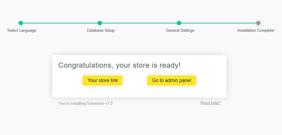 At final step, you will see a window with links to your online store and admin panel to manage your online store.