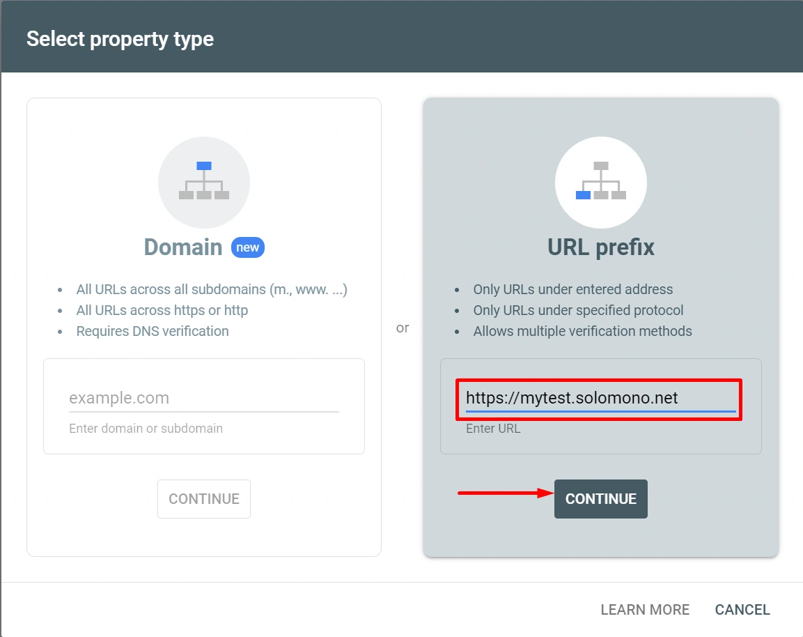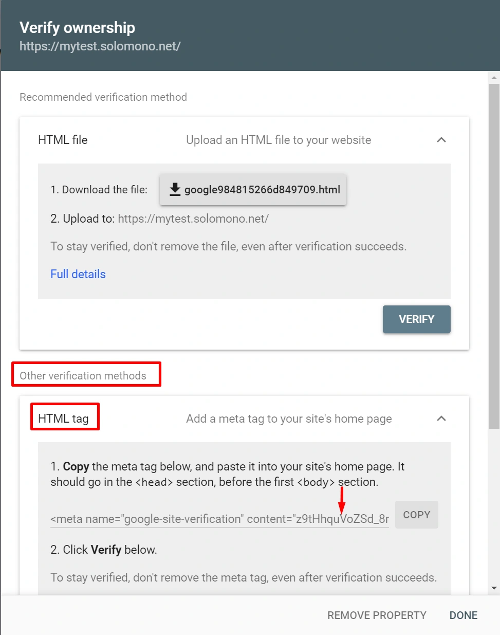 On the form that opens, copy the meta tag key, the value between the quotes in the content (you don't need to copy the entire meta tag, since we have a special functionality in the admin part to confirm the domain).