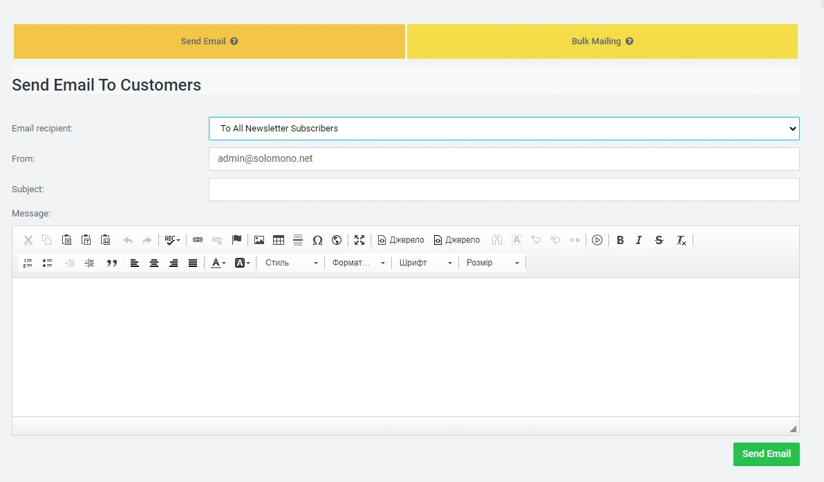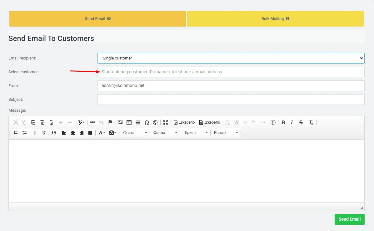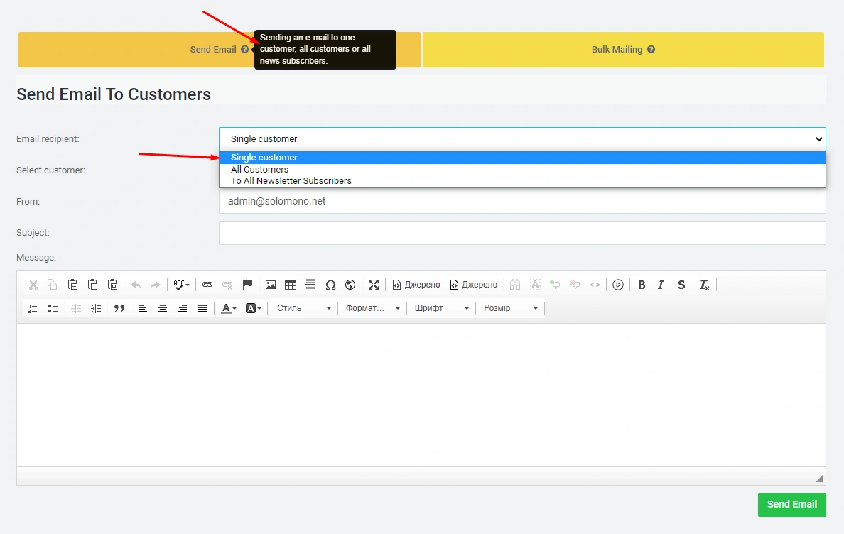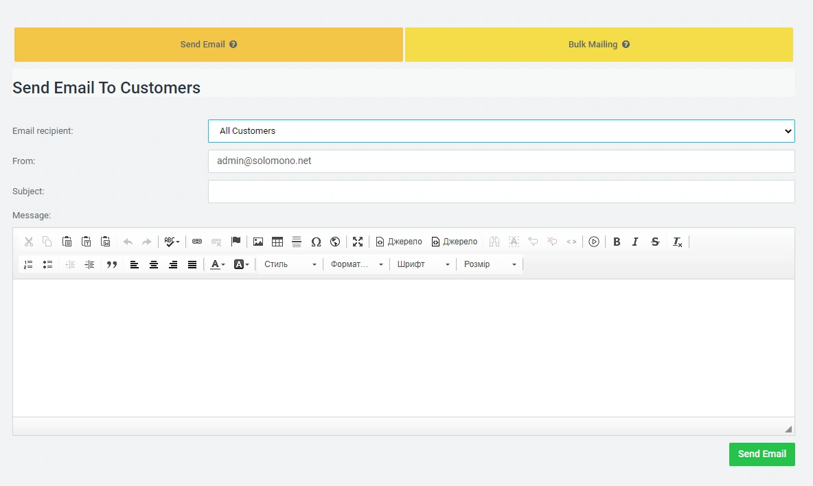 Now you do not need to use a separate email client to send a letter to your customers. SoloMono has developed a functionality for sending emails directly from the site admin panel. In the Content -> E-mail Mailings section, you can send a letter as an individual client or make a mass mailing to your chosen customers.
