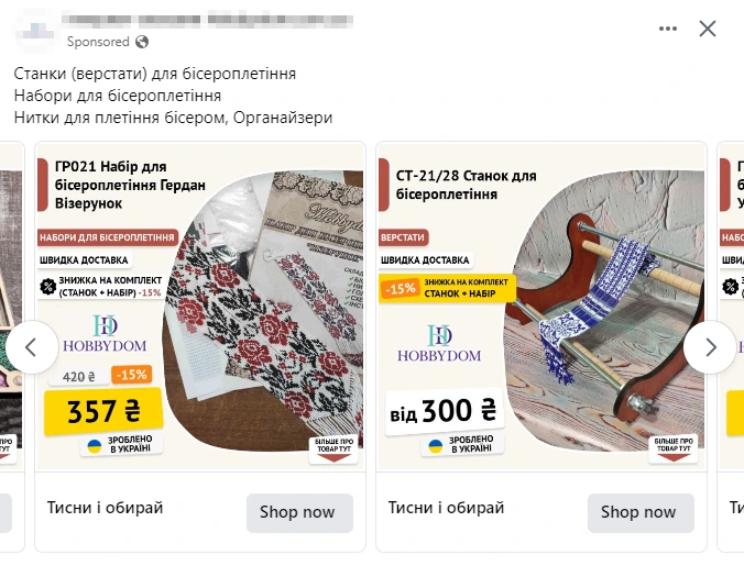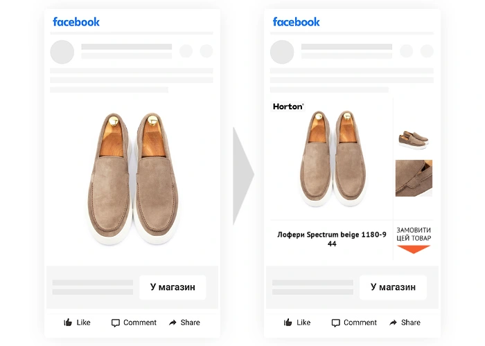 Facebook displays either the size of the discount or the price of the product. It is impossible to output everything at once, including other characteristics, through Facebook.