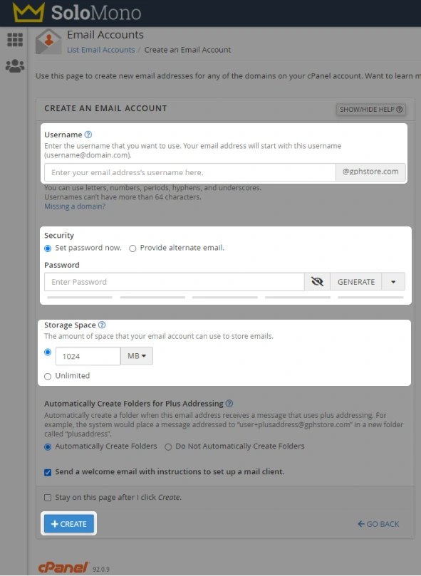 You must enter the desired name of the mailbox and select the domain name for which we create a mailbox in the "Username" field.