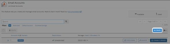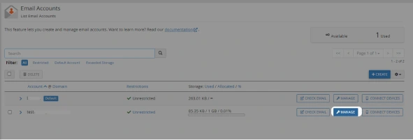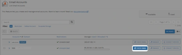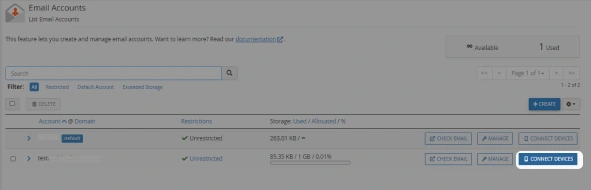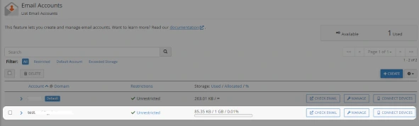 The box is created, it will appear in the table below. This table allows you to manage mailboxes. With it you can see how much disk space is occupied, change the password, change the quota, delete the box, configure the mail client.