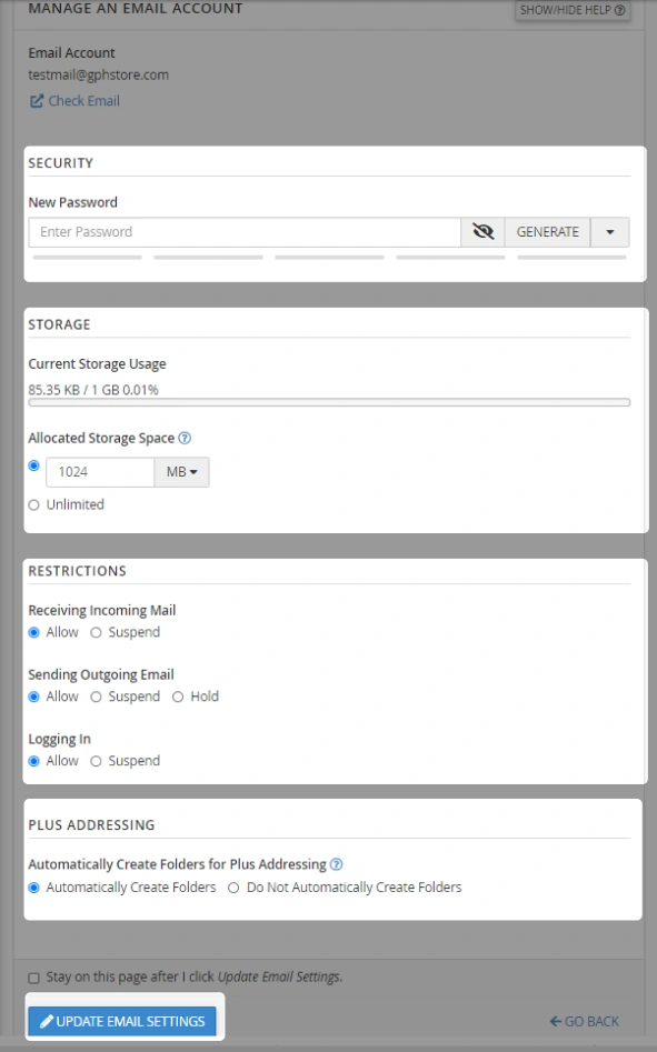 In this section, you can change the password, the amount of mailbox space, set restrictions, or create new folders for emails.