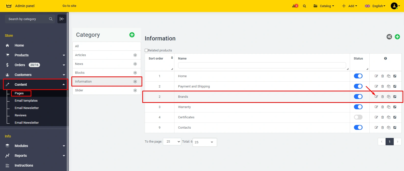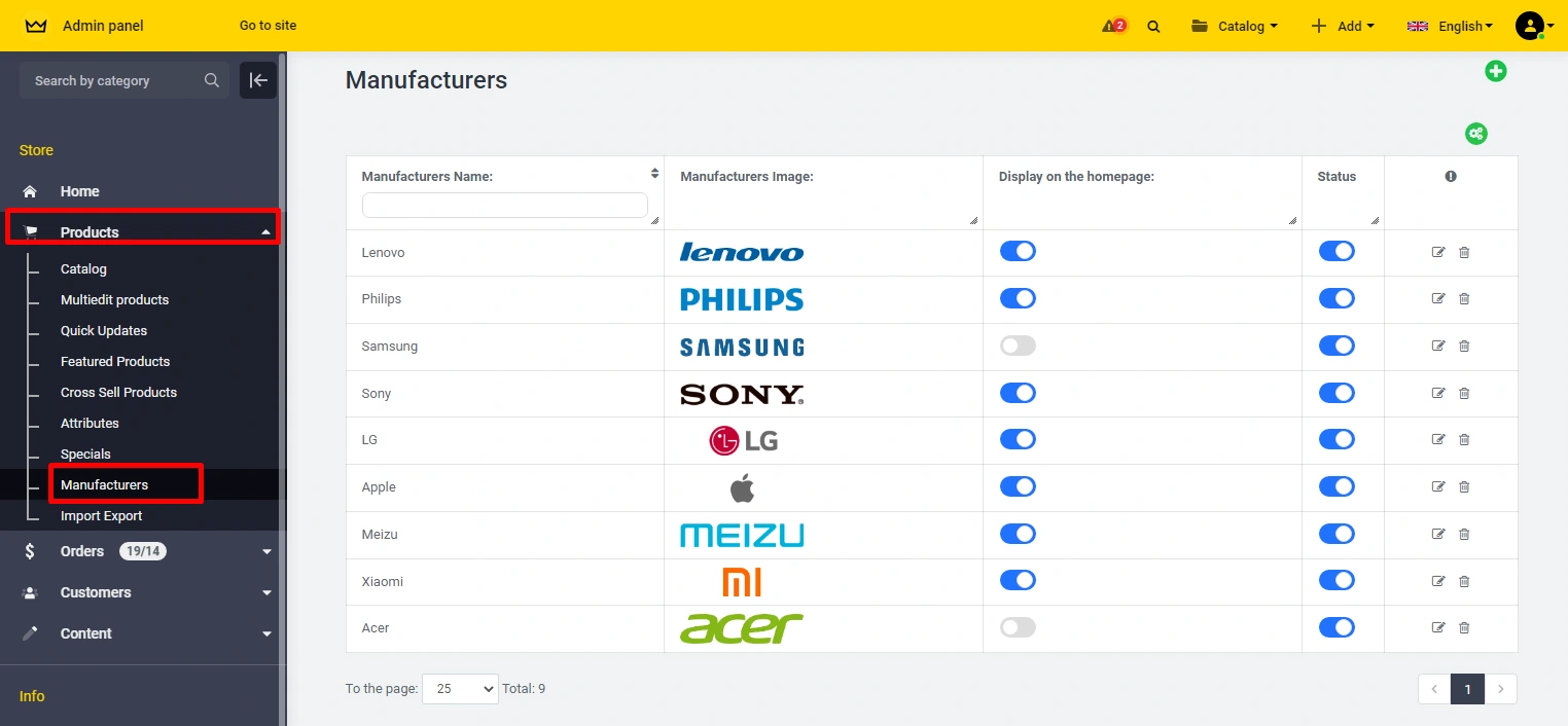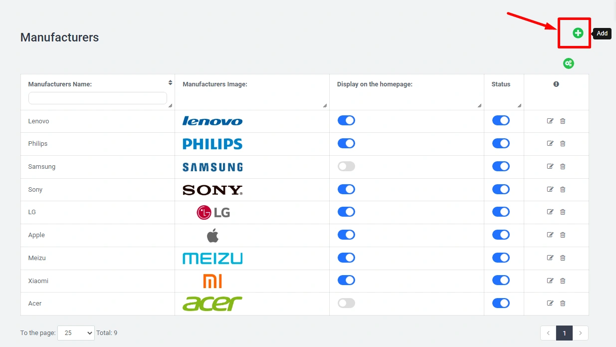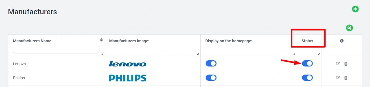 To display information about the manufacturer on the site, you need to switch the slider in the “Status” column and activate it.