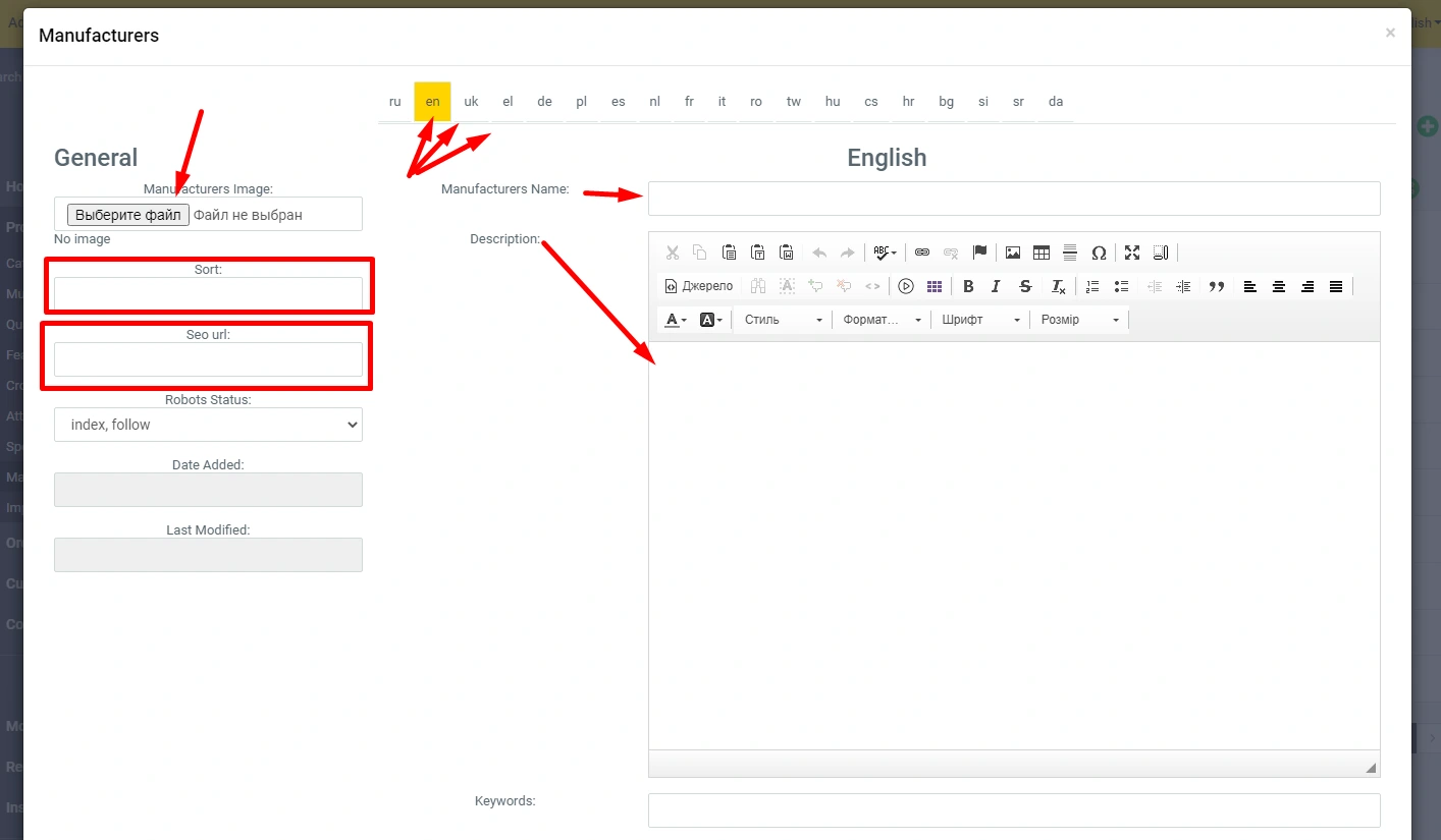The Solomono team has developed a convenient functionality for working with the database of manufacturers. Management is done through the administration panel: -> "Products" -> "Manufacturers":