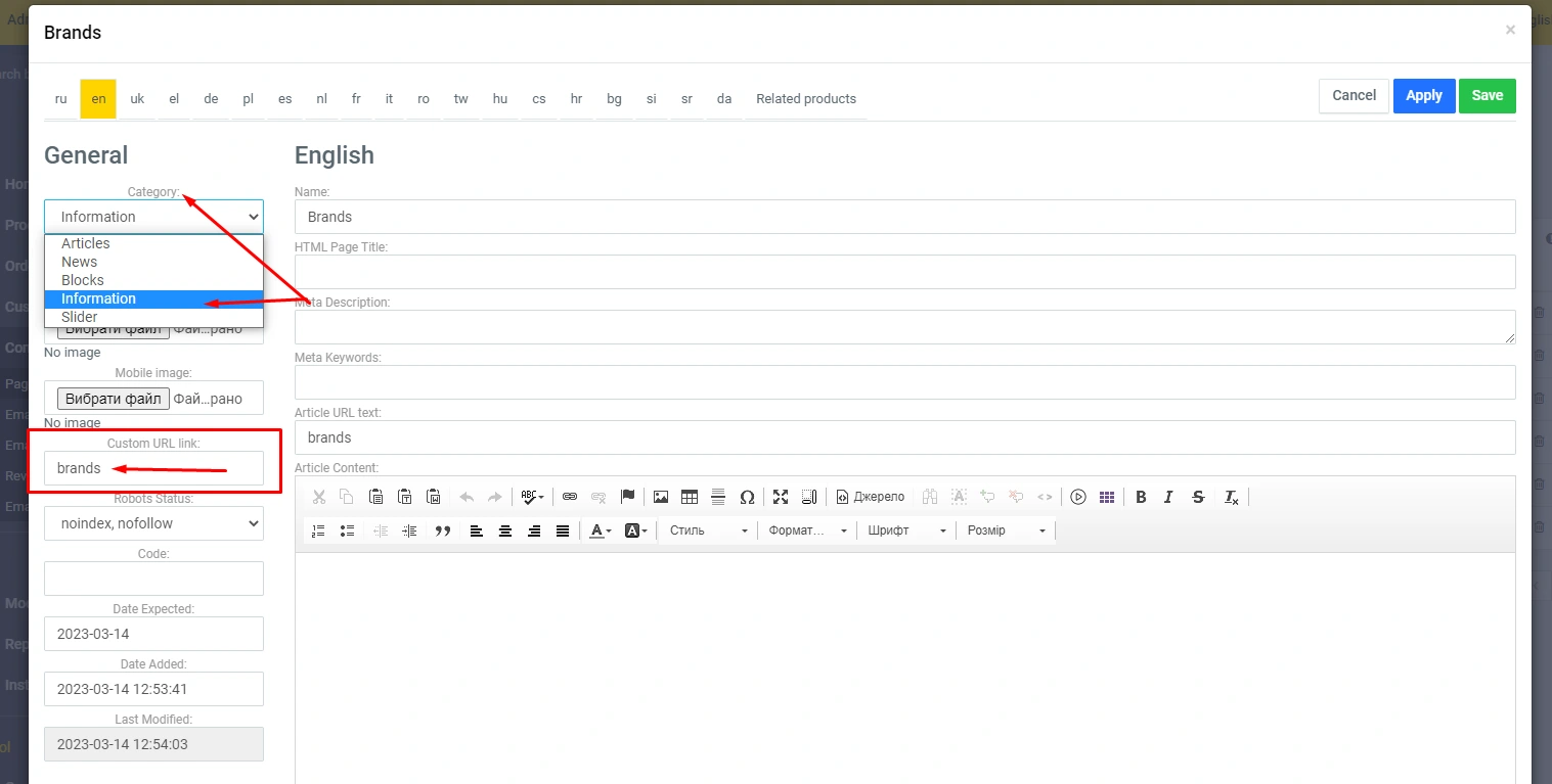 write "Alternative URL" in the line, you also need to pay attention to the fact that the block is placed in the "Information" sections, this section is responsible for displaying categories in the header of your site:
