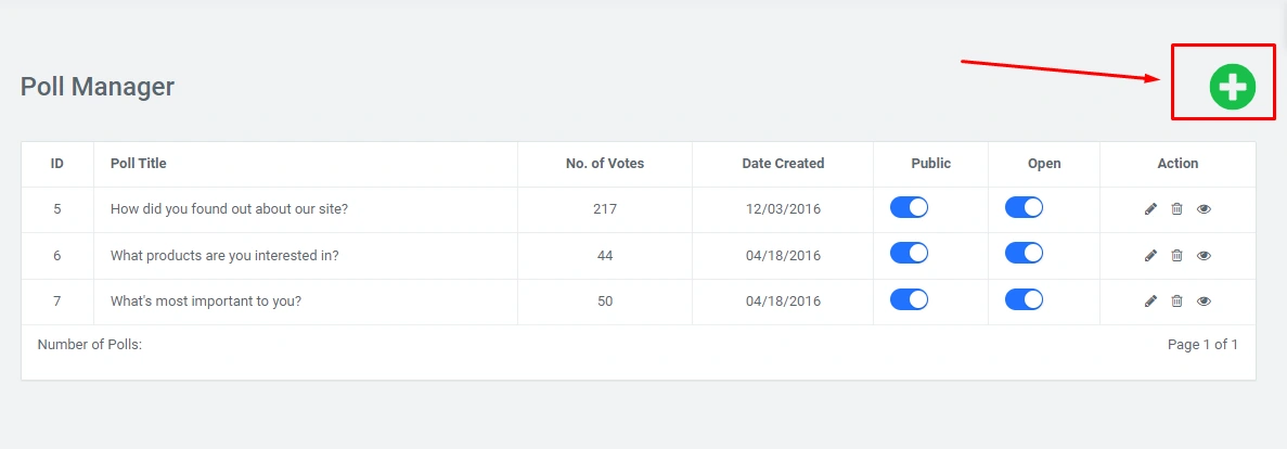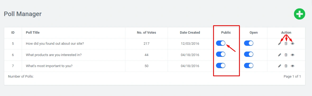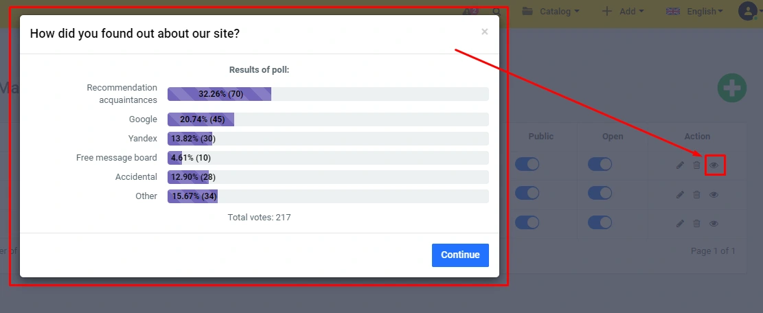 You also have the opportunity to edit the current survey or delete rows that are no longer needed. In the "Public survey" column, you can make the survey available to all users (status - enabled), or only to registered users (status - disabled)