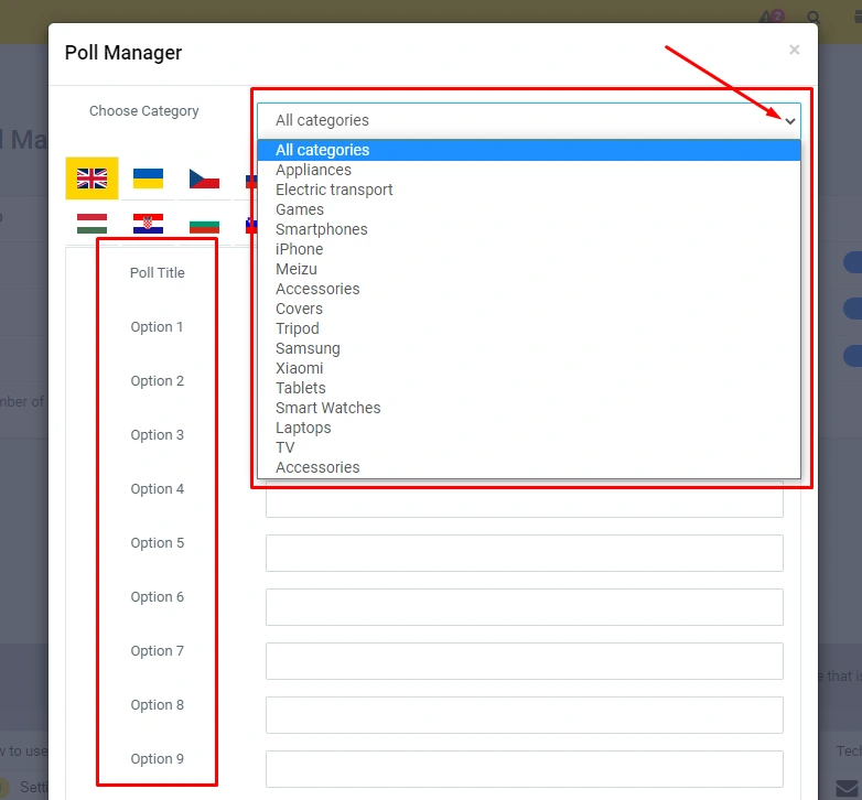 In a new window, you can select a specific category for surveys, or leave "All categories", add questions as many as you need:
