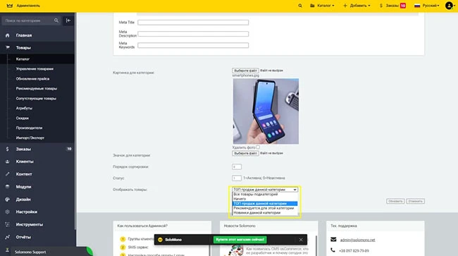 This menu element allows you to display different lists of products in a category: a regular list of products, or only TOP-selling products, or only Recommended, only New items, or not display anything.