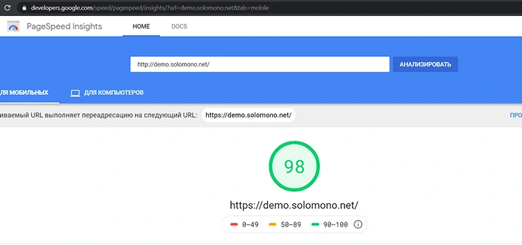 CMS for online store in Ukraine SoloMono, has the highest PageSpeed indicators. To date, the score is 98 out of 100 points, which is the highest among competitors. This means that online stores on the SoloMono platform with any amount of content are loaded as quickly as possible from both desktop and mobile devices.