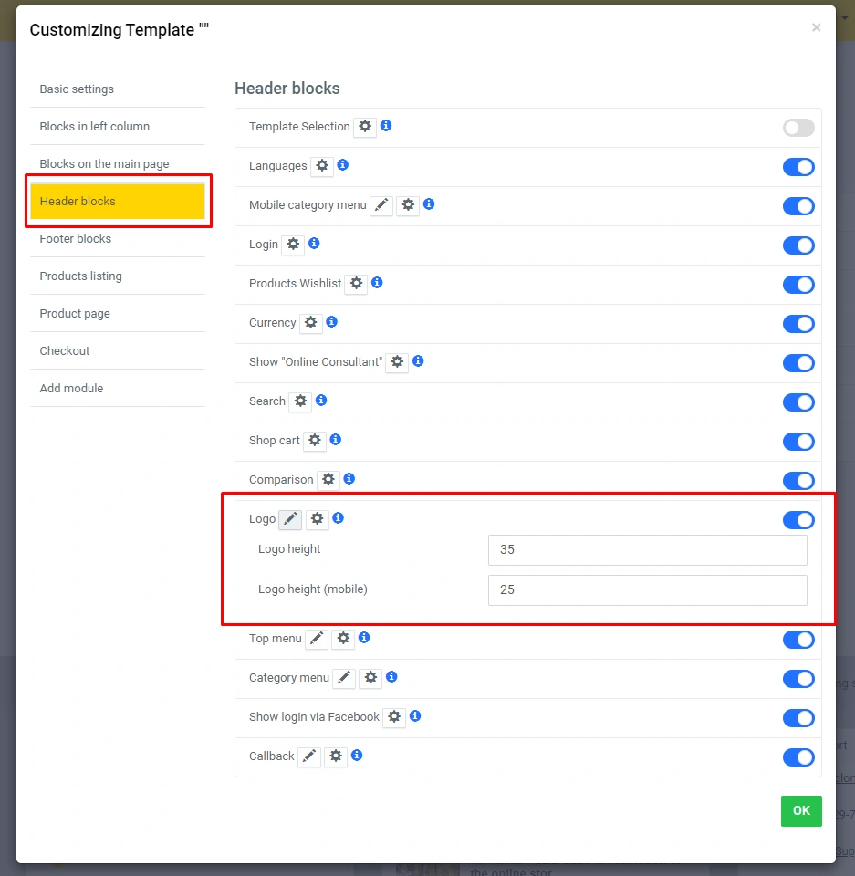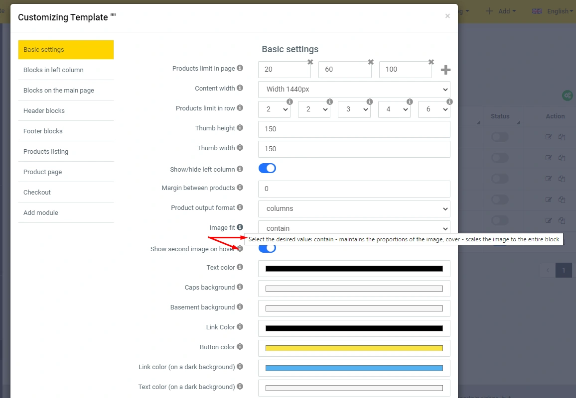 where it is possible to manipulate the size of containers for product images, logo, image display format, quantity, where for your convenience each field contains information, when you hover over it you will see a tooltip: