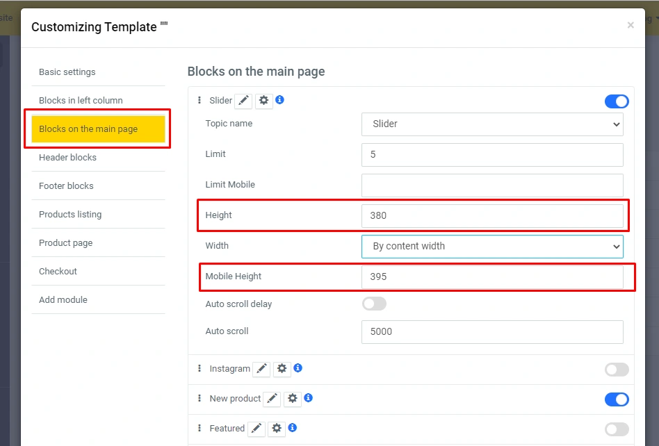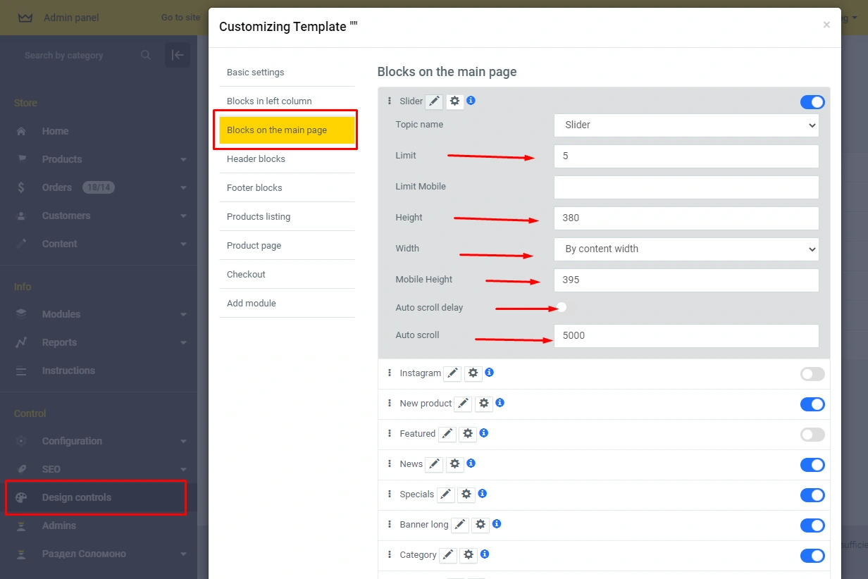 Also, our functionality provides the ability to independently set the height, width, position of the banner on the main page. To do this, in the administration panel in the “Design” -> “Template settings” -> “Blocks on the main page” section, you can set the necessary parameters: