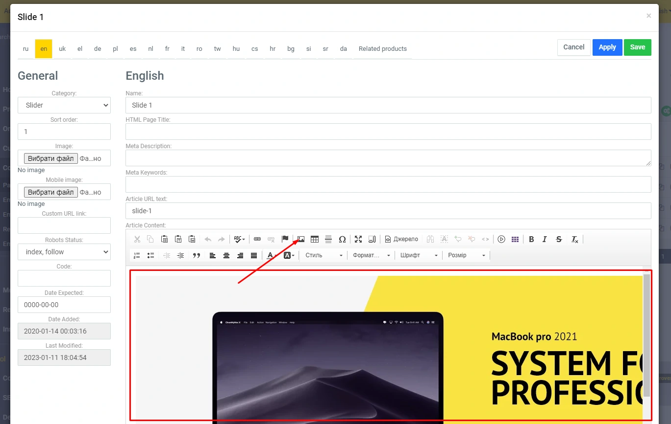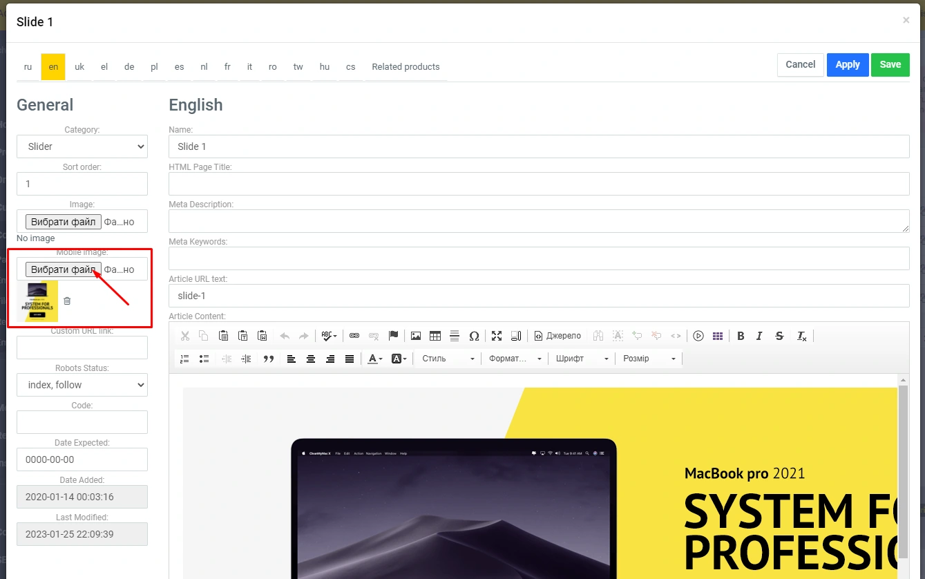 You also need to know that if your banner contains text, embedded images, which can affect the quality of the image in the mobile version, then for such options the Solomono team has added the ability to add additional banners for the mobile version, which you can add yourself through the administration panel in section “Content” -> “Pages” -> “Slider”: