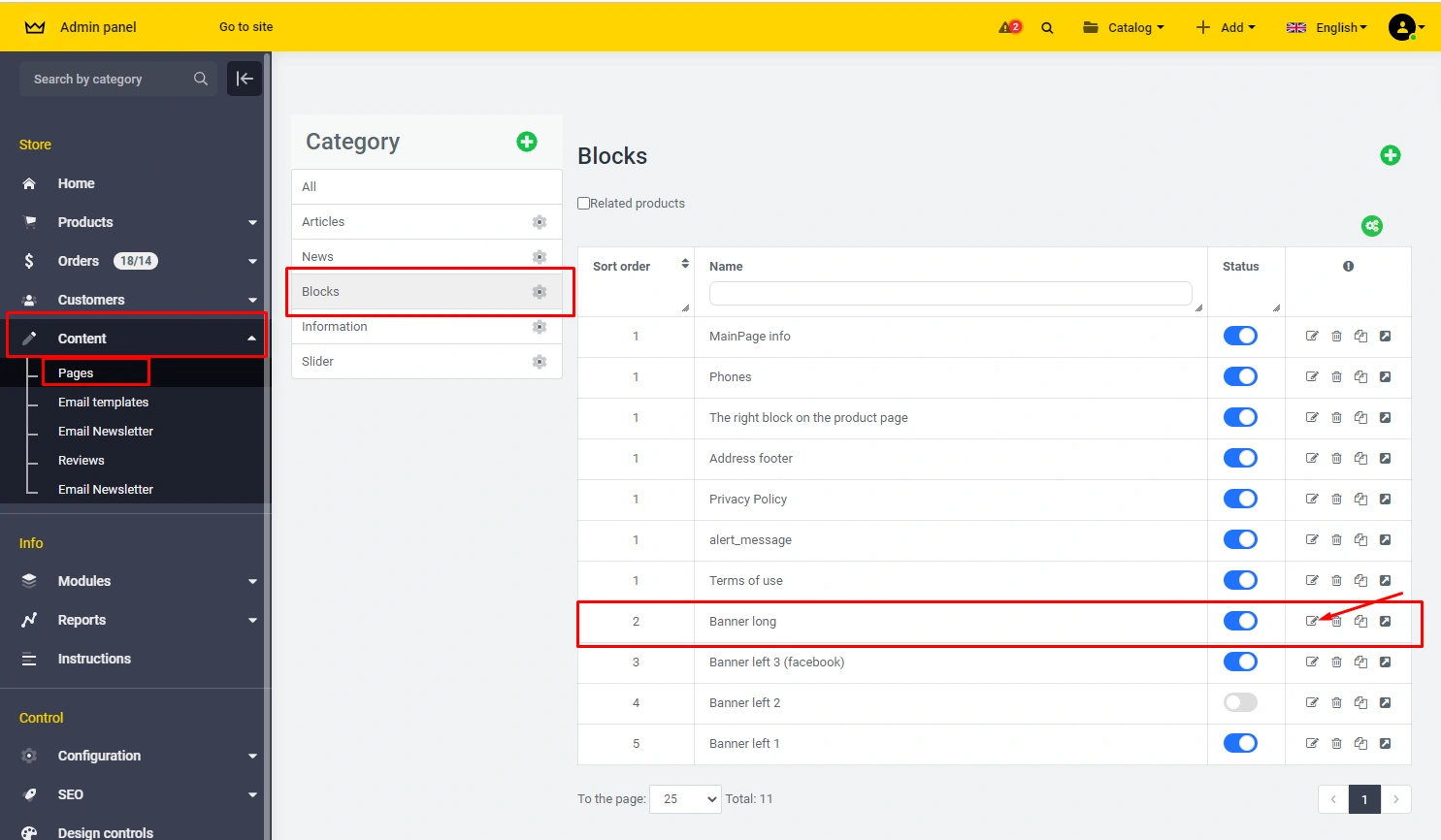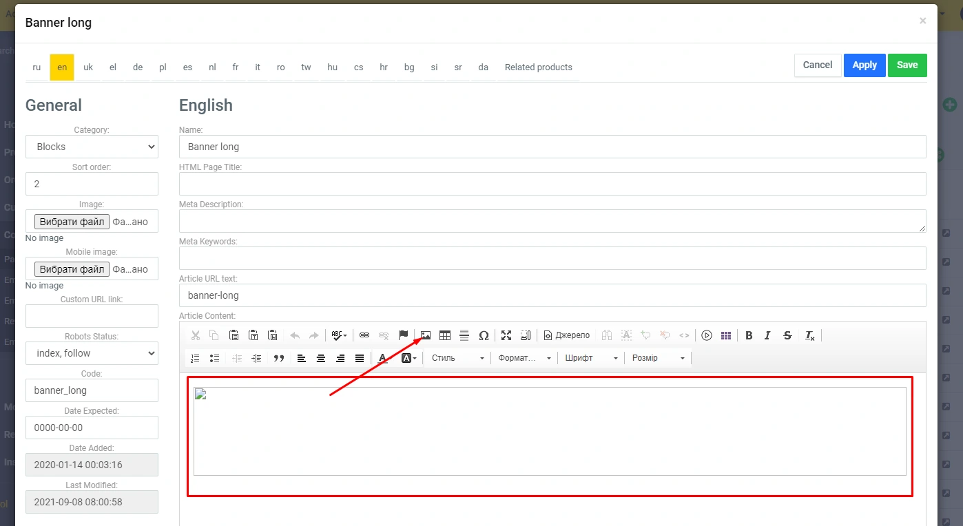 You just need to add an image in the administration panel in the “Content” -> Blocks -> “Long banner” section, and for the high-quality display of your banner, you need to choose an image that will match the width of your site content, at least 1440 pixels wide: (better, larger, for high-quality display on the screen, for example, in the range of 3000–4000 pixels.)