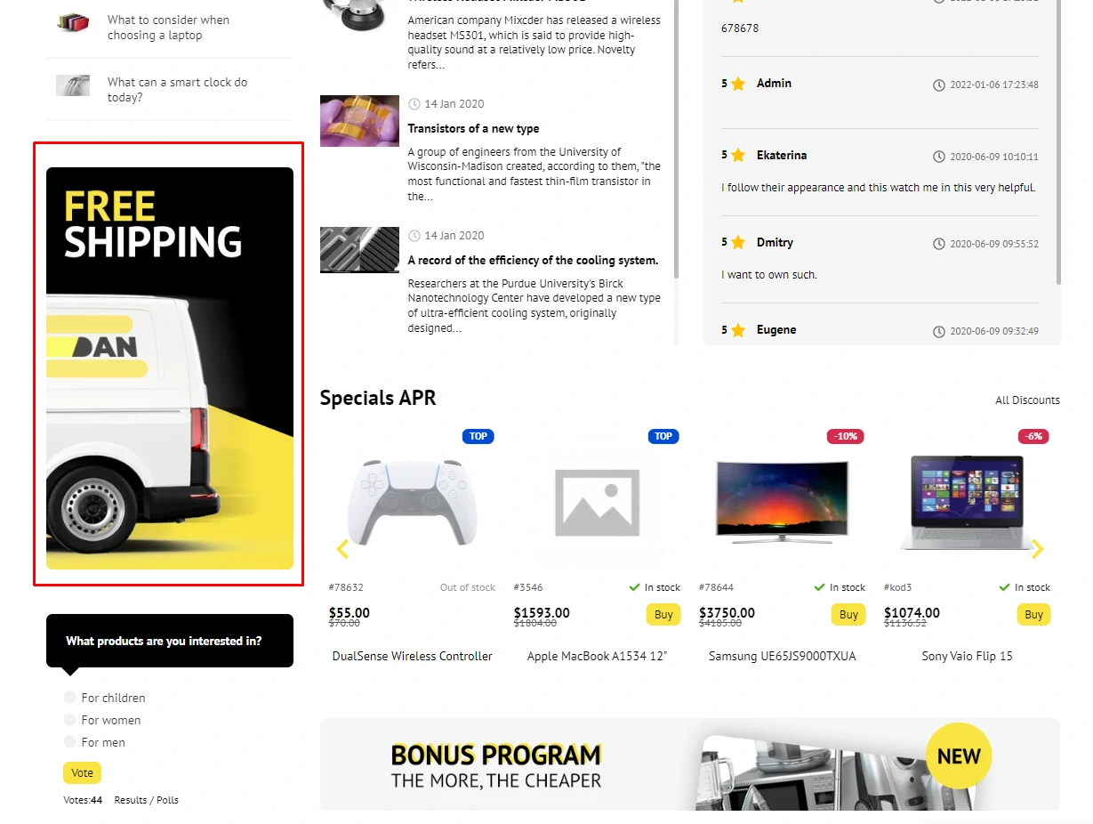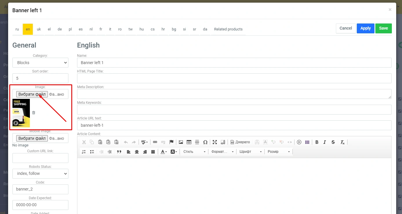 You need to add an image in the administration panel in the “Content” -> Blocks -> “Banner on the left” section, and for the high-quality display of your banner, you need to select an image at least 345 pixels wide: (better, larger, for better display on the screen). The height of the image is not so important, as it is adjusted proportionally to the width. The main thing is to ensure that the image is wide enough.