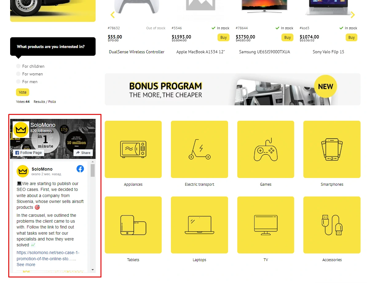 The Solomono team has developed functionality so that such a banner independently adjusts to different sizes of site blocks and the content is displayed correctly.
