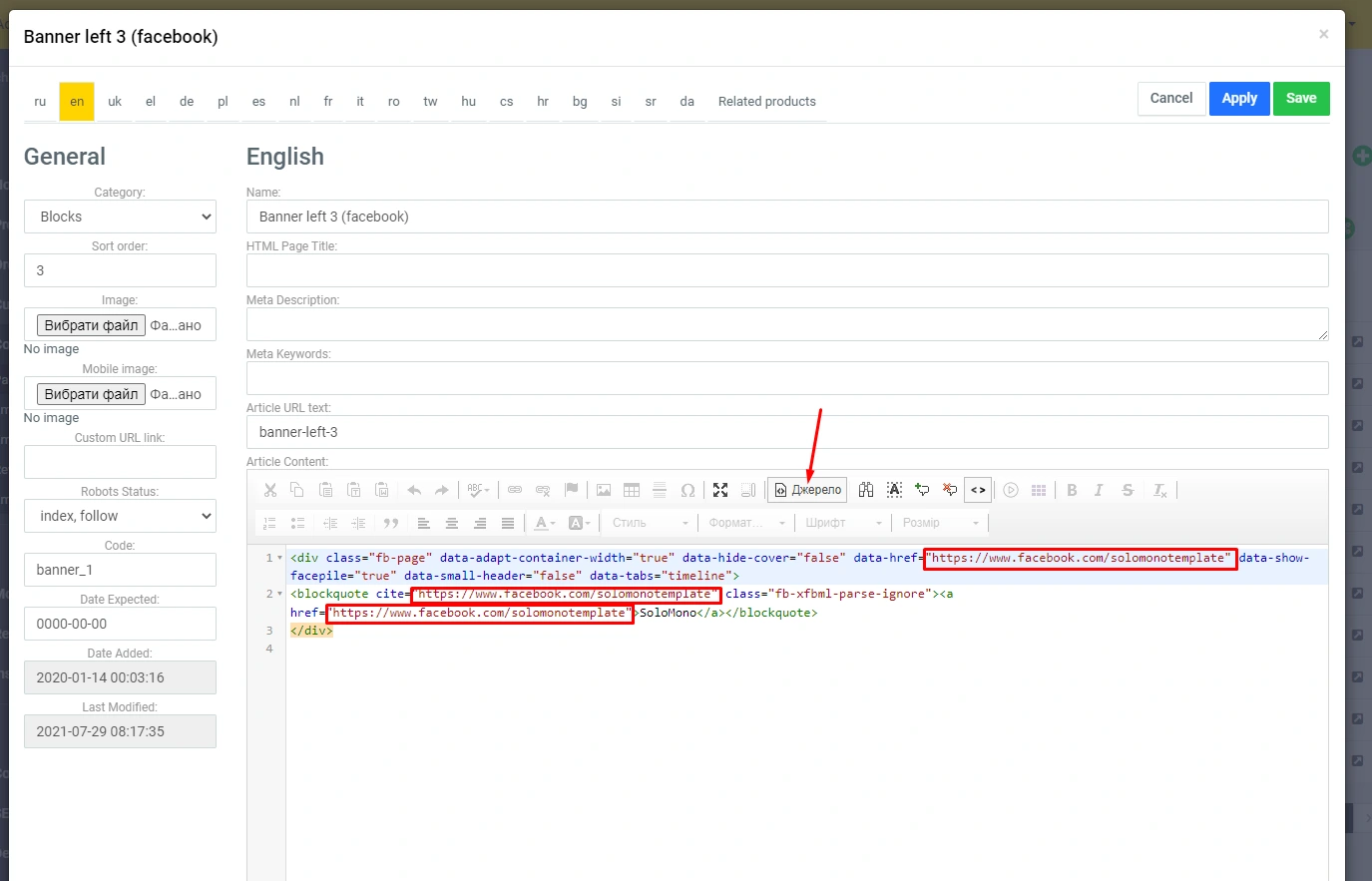 You need in the administration panel in the section “Content” -> Blocks” -> “Banner on the left (facebook)”, -> clicking the “source” button -> add links to your facebook account, -> and set the name:
