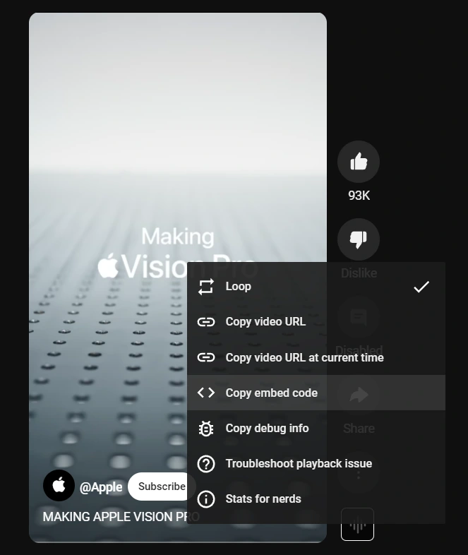 Jeśli chcesz dodać wideo YouTube Shorts, link do niego należy skopiować inaczej, aby działał poprawnie. Kliknij prawym przyciskiem myszy na wideo i kliknij "Kopiuj kod osadzenia".