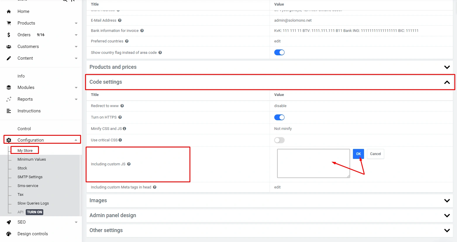 Po jego otrzymaniu przechodzimy do „Ustawienia” -> „Mój sklep” -> „Ustawienia kodu” i na prawo od wartości „Zawiera skrypty JS”, klikamy „edytuj” i w okienku wpisujemy przygotowany przez nas skrypt i klikamy "w porządku".