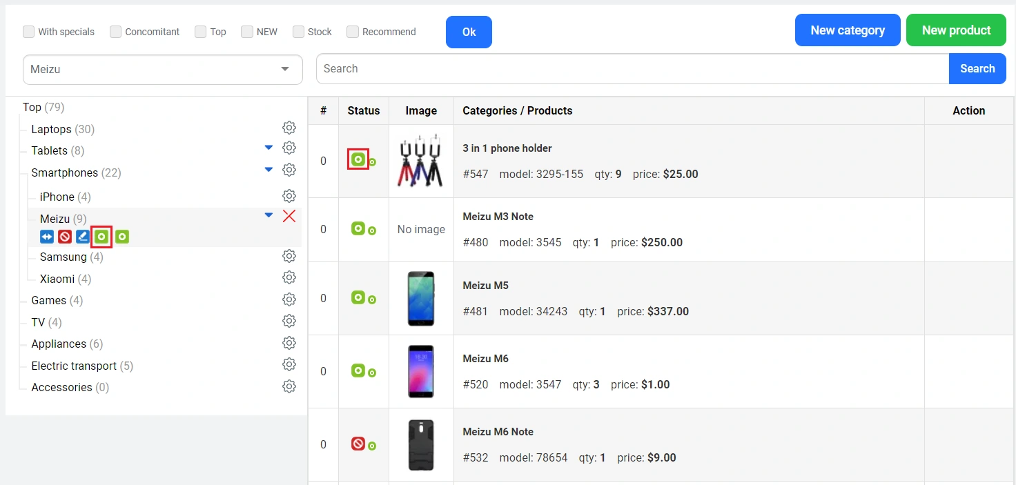 Zarządzanie odbywa się za pomocą panelu administracyjnego na stronie "Produkty" - "Katalog". Aby wyłączyć wyświetlanie kategorii na stronie, kliknij pierwszy zielony znacznik pod kategorią, jak pokazano na zrzucie ekranu. Jeśli chcesz ukryć jakiś produkt, kliknij na taki znacznik w kolumnie "Status" obok pożądanego produktu.