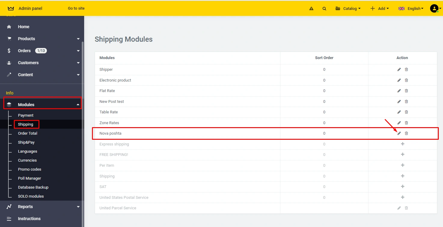 Przejdź do sekcji „Moduły” -> „Dostawa” -> „Moduły doręczeń” -> „Nowa poczta” i kliknij w ikonę „edytuj”: