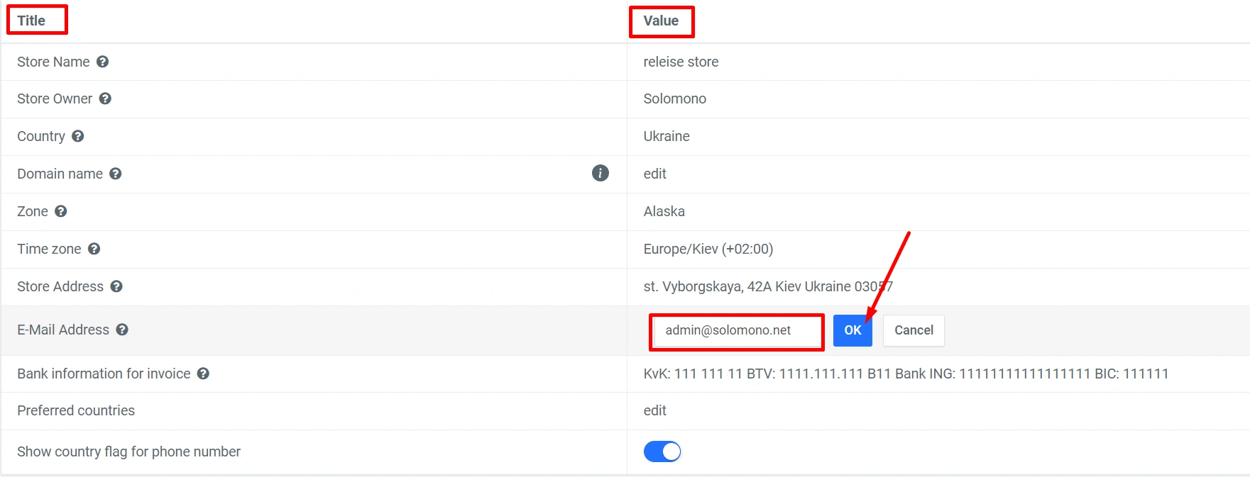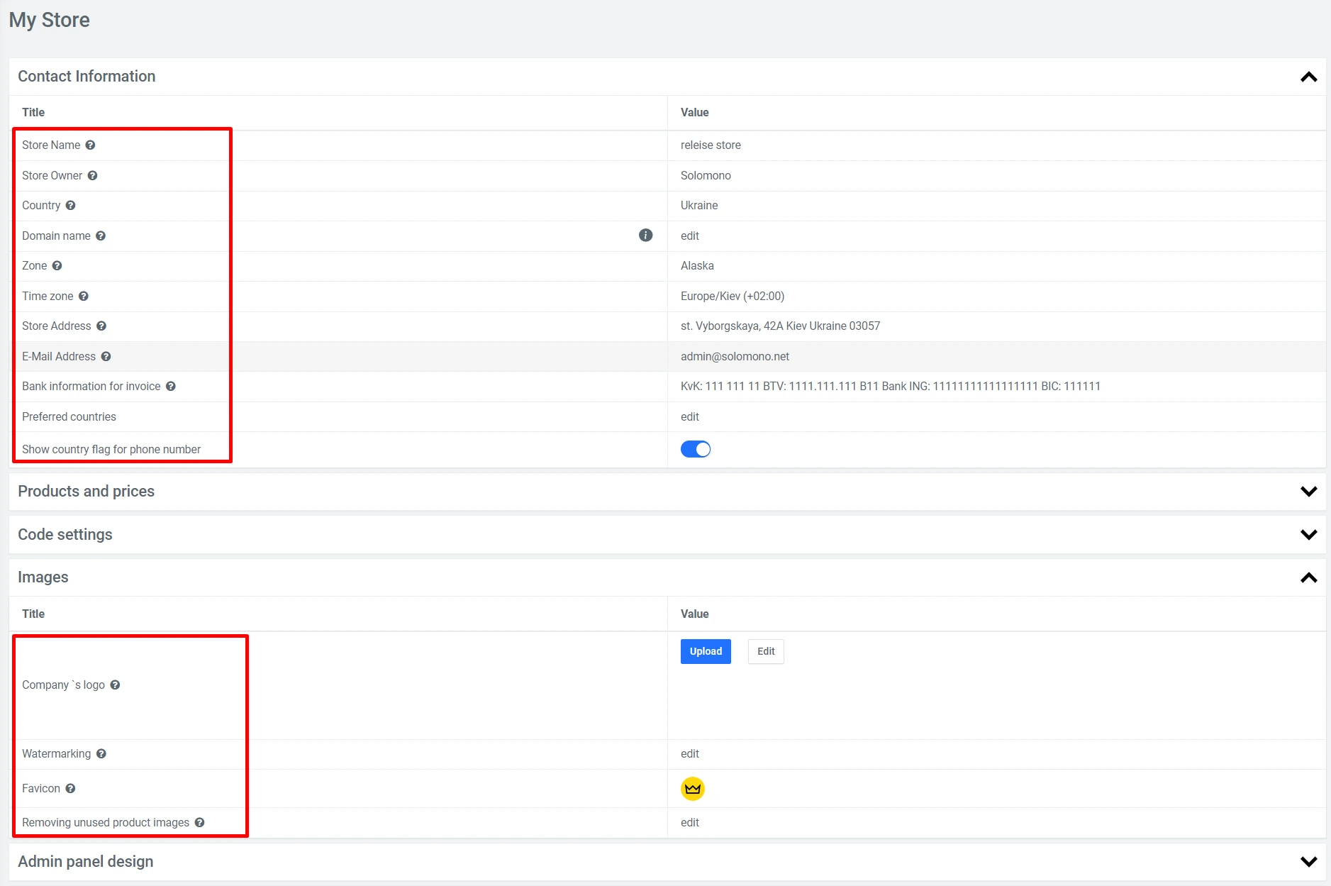 Tutaj możesz zmienić nazwę sklepu, adres e-mail, region, pobierz logo i фавикон, ustawić znak wodny itp.