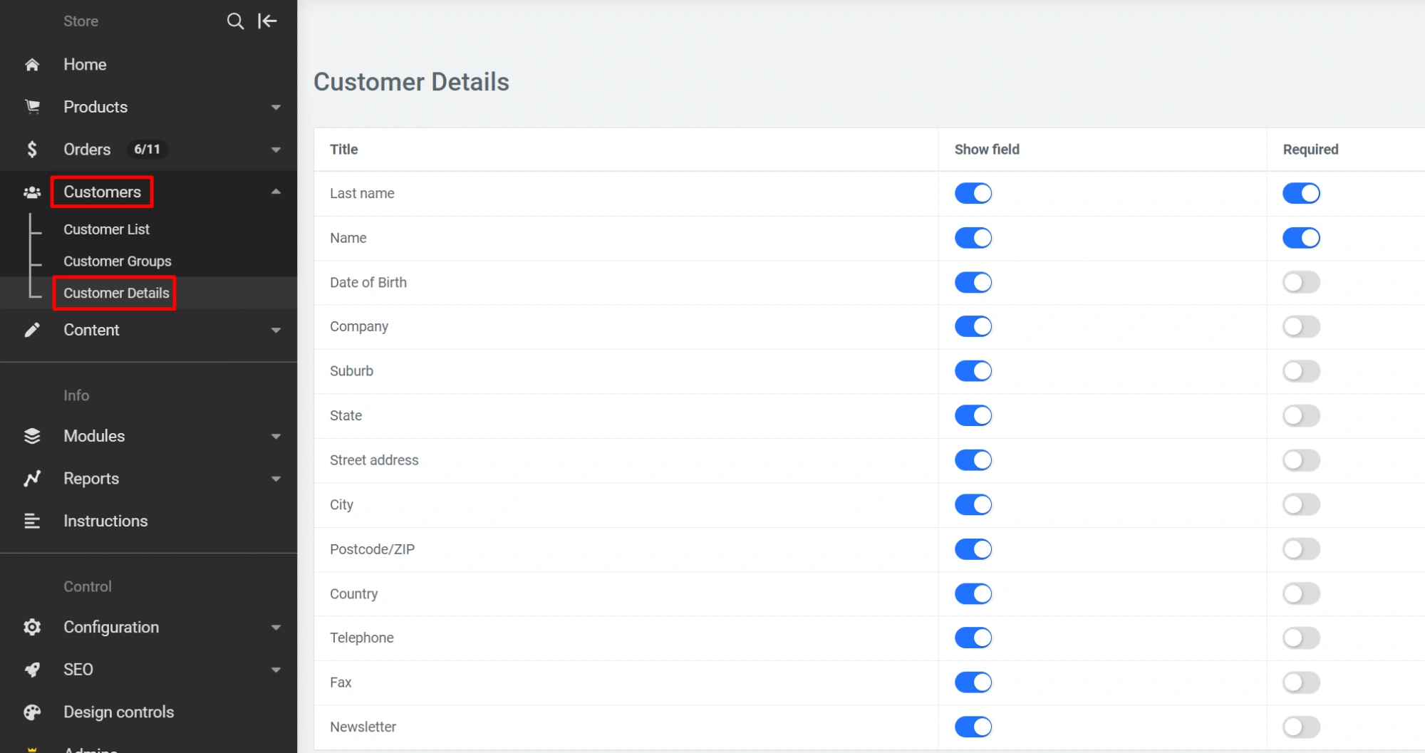 "Dane o kupującym" są używane podczas rejestracji i składania zamówienia, więc można wybrać to, co trzeba. Przesuń suwak i wyświetlane informacje będzie "aktywna / nie aktywna".