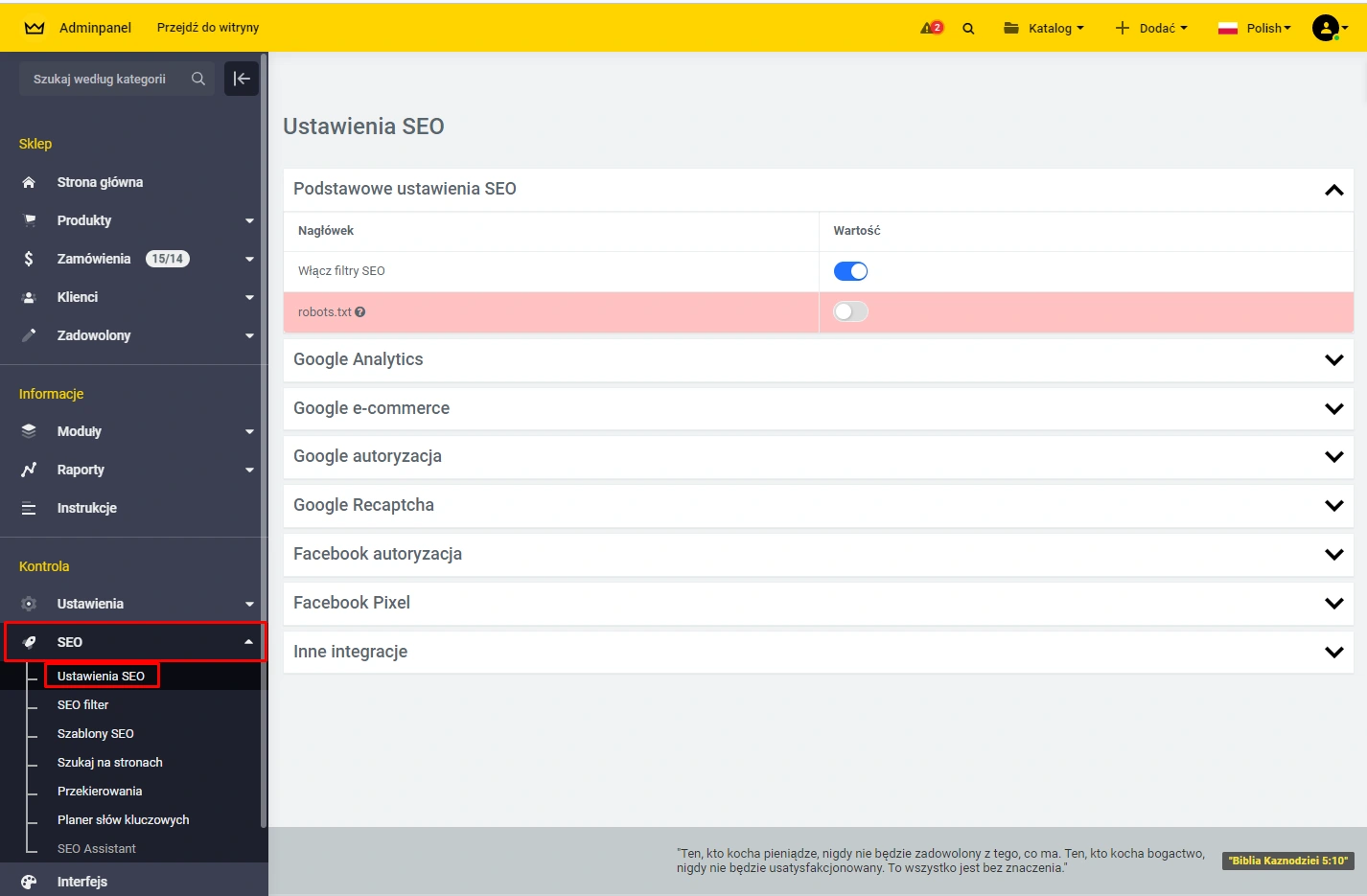 Zespół Solomono opracował wygodną funkcjonalność do pracy z ustawieniami SEO. W tym celu przejdź do sekcji panelu administracyjnego SEO -> Ustawienia SEO:
