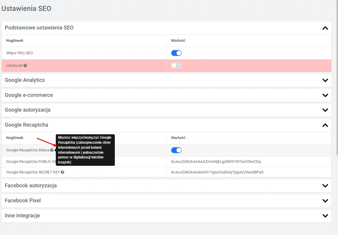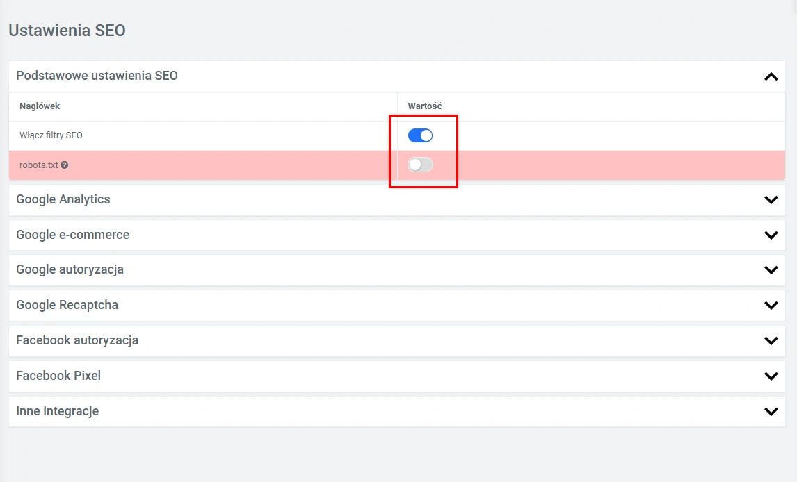 Tutaj masz możliwość włączenia/wyłączenia statusu dla ustawień SEO poprzez naciśnięcie przełącznika przycisku statusu: