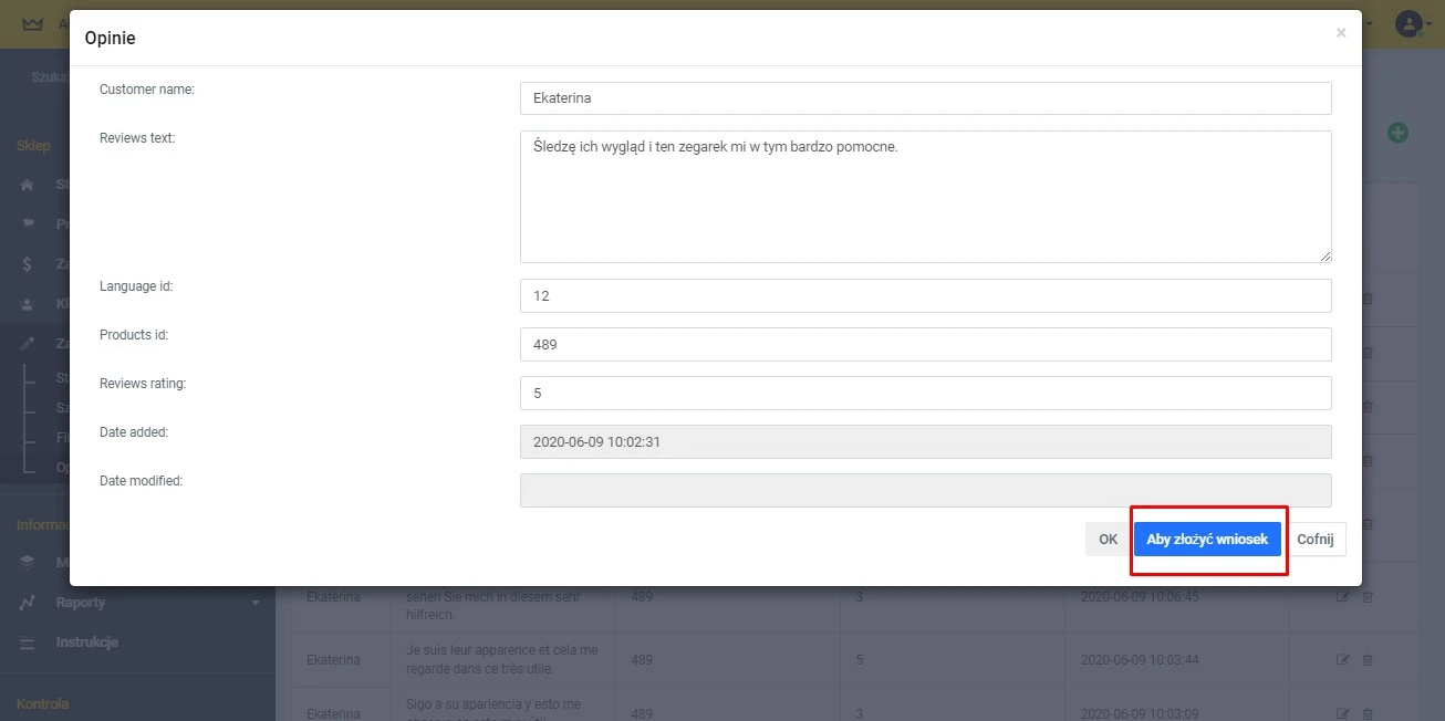 Dla recenzji dostępne są następujące akcje: „Dodaj”, „Zmień”, Usuń . Po kliknięciu przycisku „Zmień” otworzy się przed Tobą formularz do edycji – wyświetla on: Nazwa, Tekst recenzji, Identyfikator języka, Identyfikator produktu, Ocena recenzji, Data.