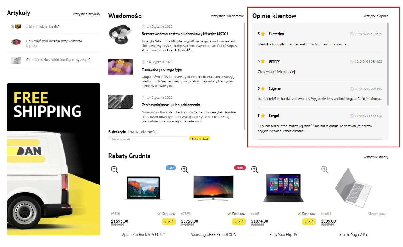 Dla administratora serwisu dostępna będzie strona ze wszystkimi recenzjami, która pozwoli mu szybko odpowiadać na wszystkie nowe recenzje. Dostępna jest również funkcjonalność pozwalająca na edycję i usuwanie aktualnych recenzji. W ustawieniach sklepu, w zakładce mój sklep, można uniemożliwić niezarejestrowanym użytkownikom wystawianie recenzji.
