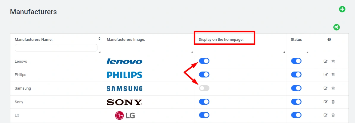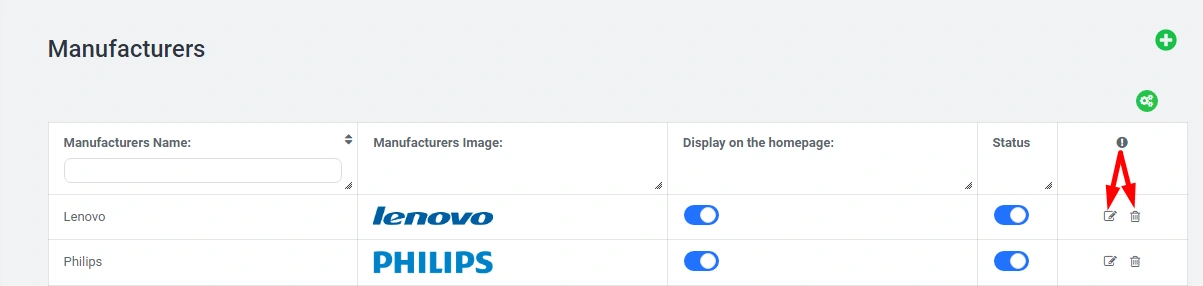 Aby wyświetlić informacje o producencie na stronie, musisz przełączyć suwak w kolumnie „Status” i aktywować go.