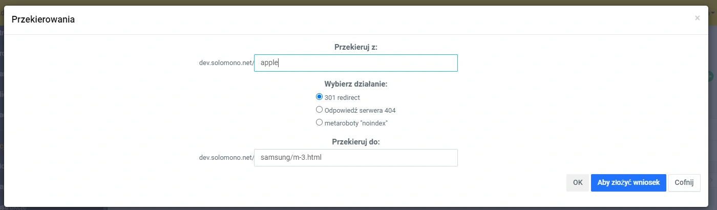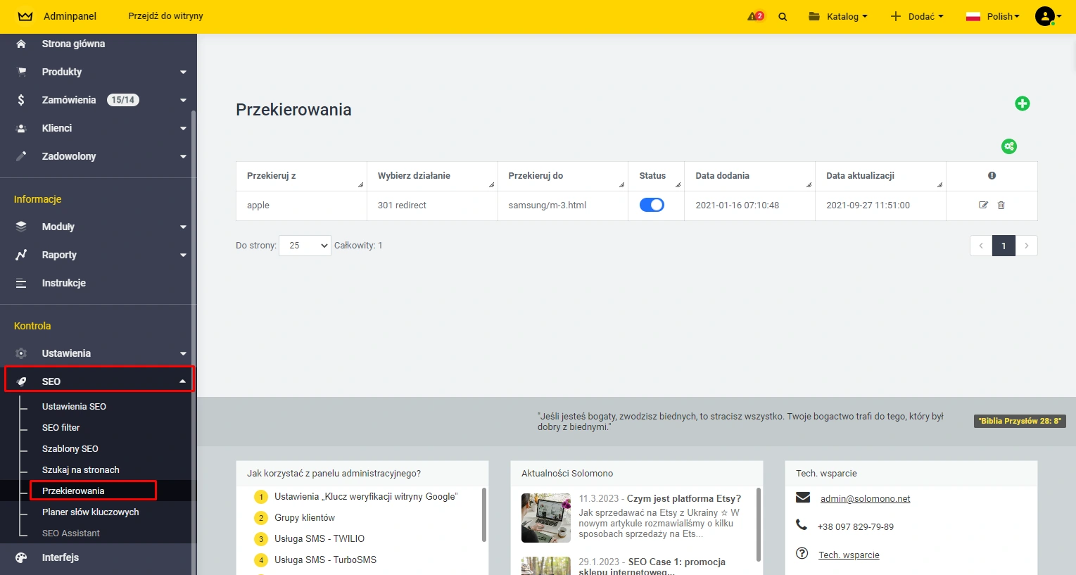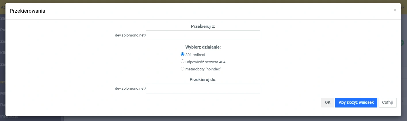 Zespół Solomono opracował wygodną funkcjonalność do pracy z przekierowaniami. Aby ustawić przekierowanie należy przejść do strony administracyjnej w sekcji SEO -> Przekierowania -> kliknąć na "+":
