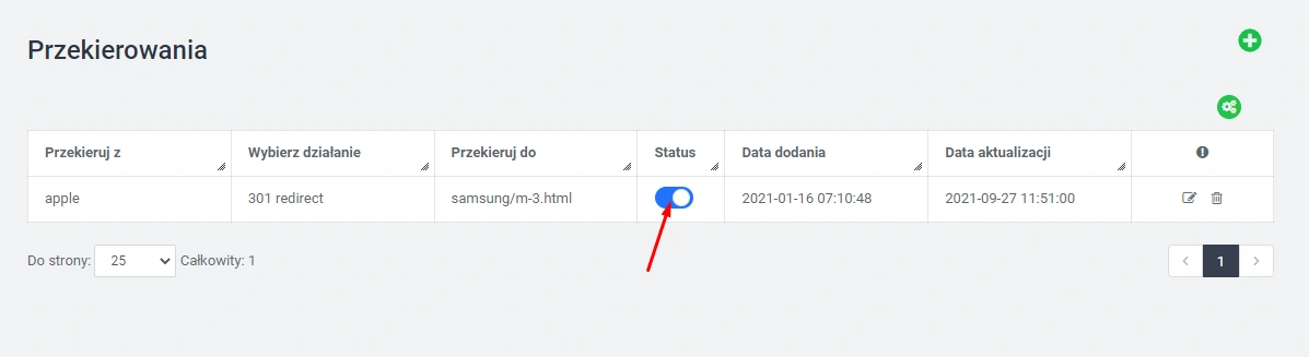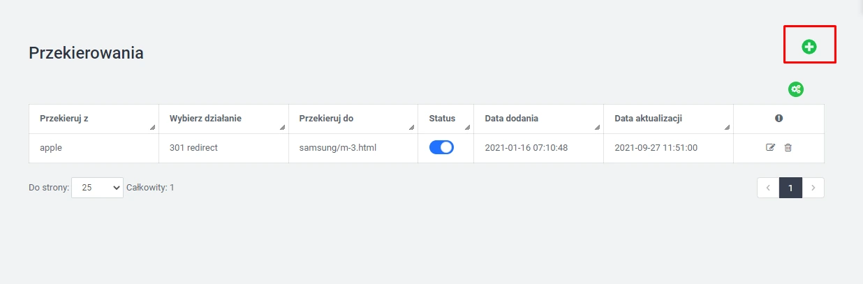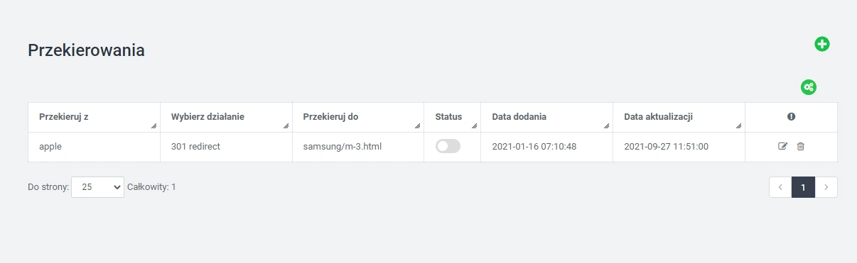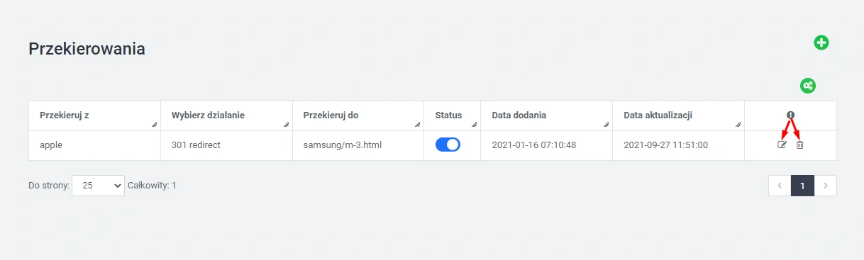 Możesz także edytować lub usuwać istniejące przekierowania, klikając odpowiedni przycisk w kolumnie akcji: