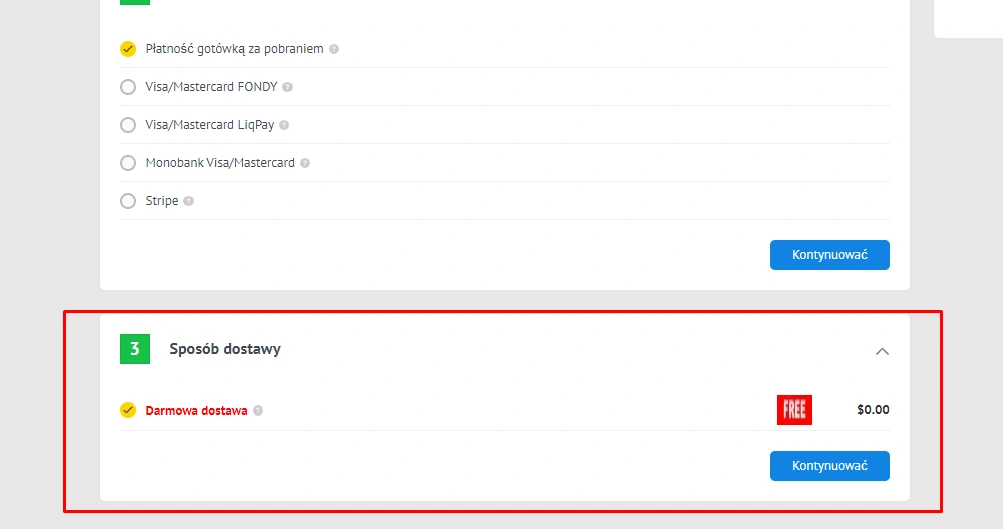 WAŻNY! Jeśli wybrałeś moduł dostawy „Darmowa dostawa”, inne moduły nie będą dla Ciebie wyświetlane, ponieważ bezpłatna dostawa będzie miała priorytet.