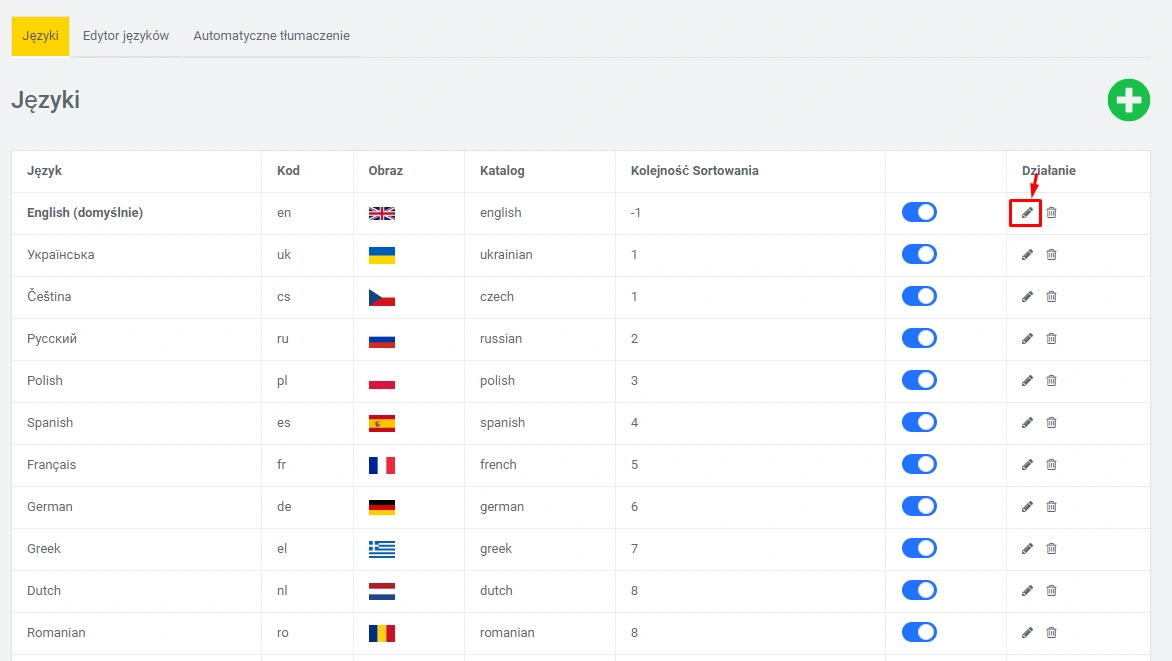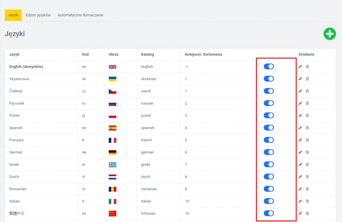 Opcjonalnie możesz włączyć/wykluczyć języki – w kolumnie „status”, przesuwając dźwignię: