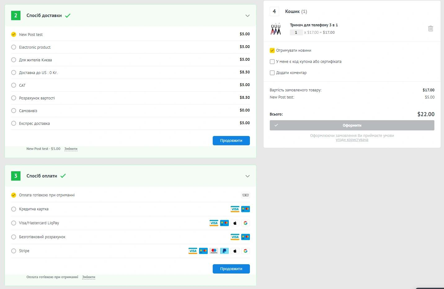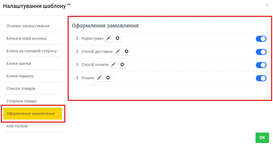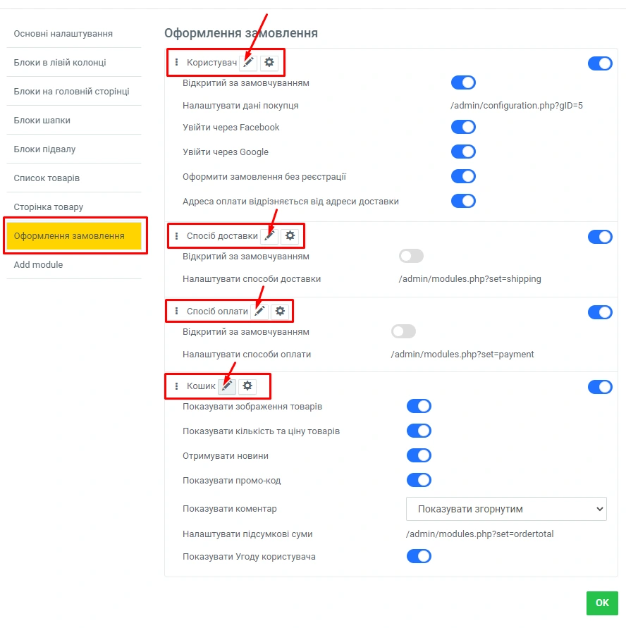 You have the opportunity to change the position of certain blocks in the checkout of your site, for this, in the admin panel, you need to click on the “three dots” icon and, holding it down, move the block to the place you need, up or down, and the blocks in the checkout will take the appropriate place place according to the admin panel. You also have the option to disable/enable this block for display in the checkout and also manage the functionality, if you click on the "pencil" icon, a panel with the available functionality of this section will open.