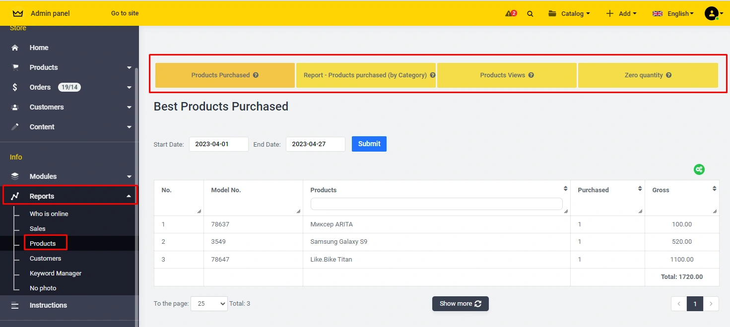 The report is generated and viewed through the administration panel -> "Reports" -> "Products", where it is possible to generate a report for the following categories: "Ordered products", "Ordered products by category", "Product views", Zero quantity