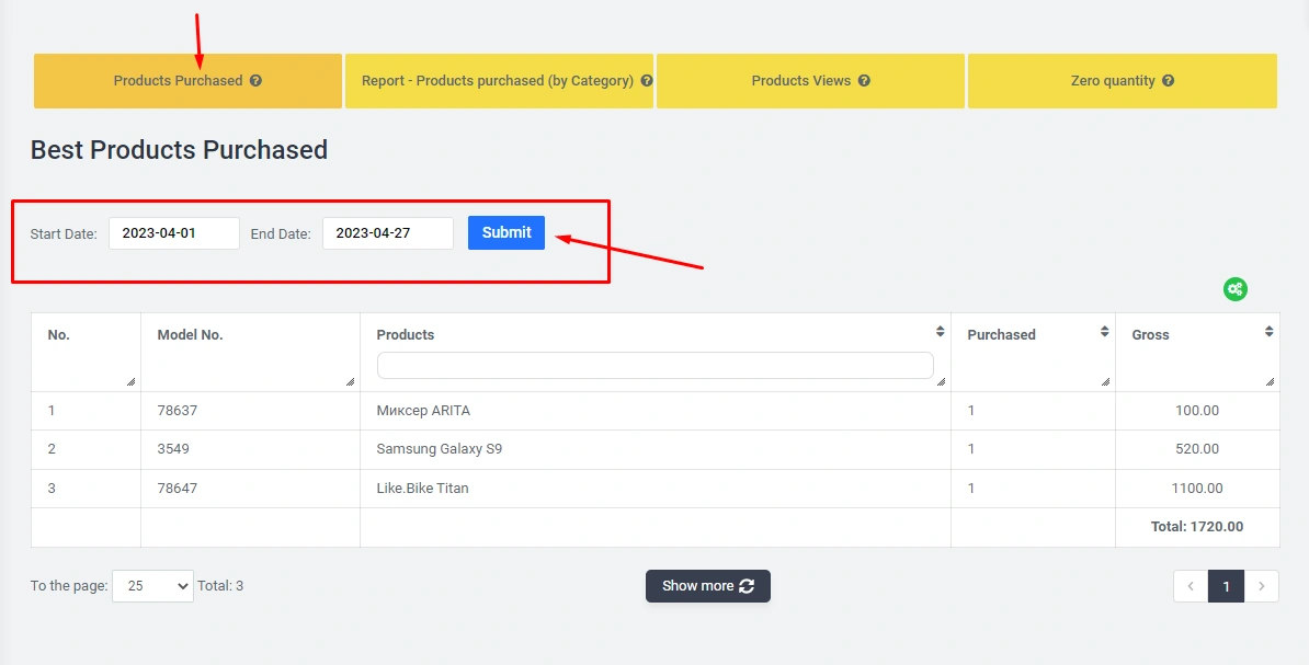 The Ordered goods report, in which you can set the period you need and analyze the data: