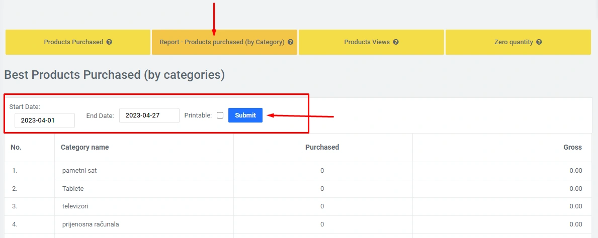 Report Ordered goods by categories, here you can also set the period for generating the report: