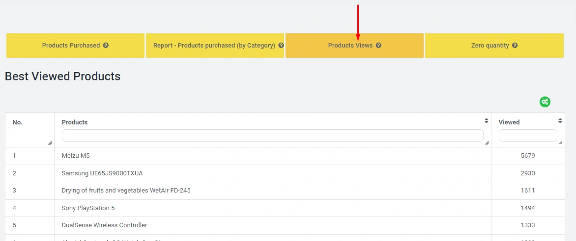 Product Views report, here you have the opportunity to analyze the "Most Viewed Products", in the "Viewed" column the number of views for a particular product is indicated: