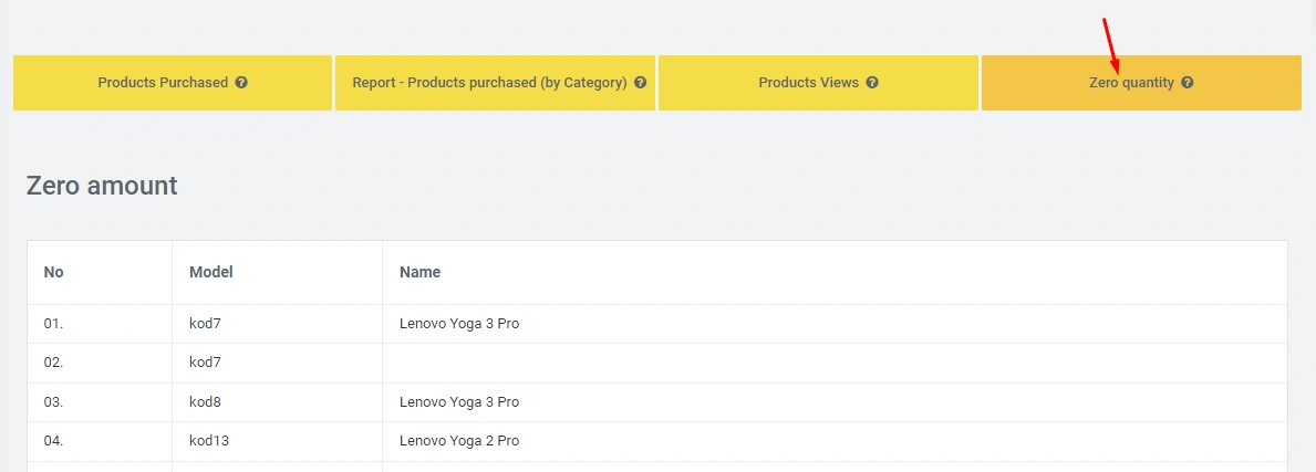 Report Zero Quantity, here you can analyze products that have zero balances, that is, are not in stock: