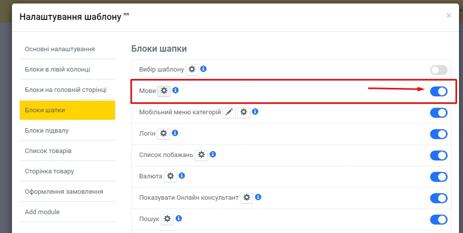 В разделе “Языки” Вы можете включать/выключать блок с языками в шапке Вашего сайта.