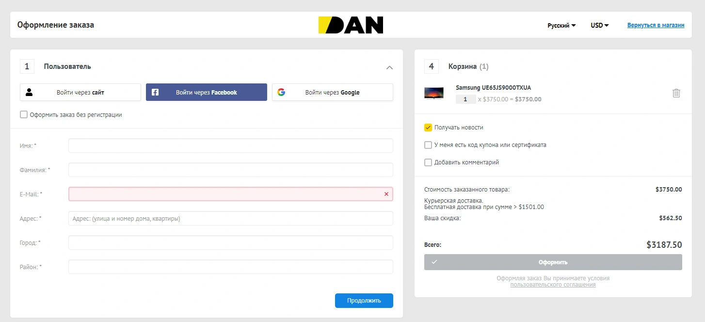 Такой подход существенно увеличивает конверсию и общий опыт использования сайта, уменьшает время оформления заказа и время его обработки менеджером магазина, а так же уменьшает контакт продавца с покупателем и вероятность ошибки менеджера.